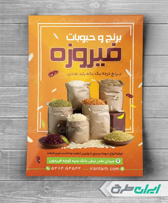 تراکت لایه باز فروشگاه برنج و حبوبات، توسط تیم ایران طرح برای بازاریابی و تبلیغات این فروشگاه طراحی شده است.