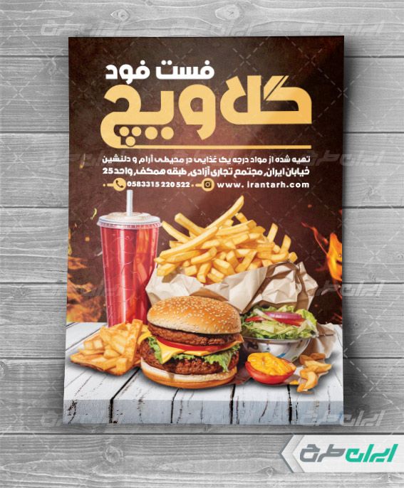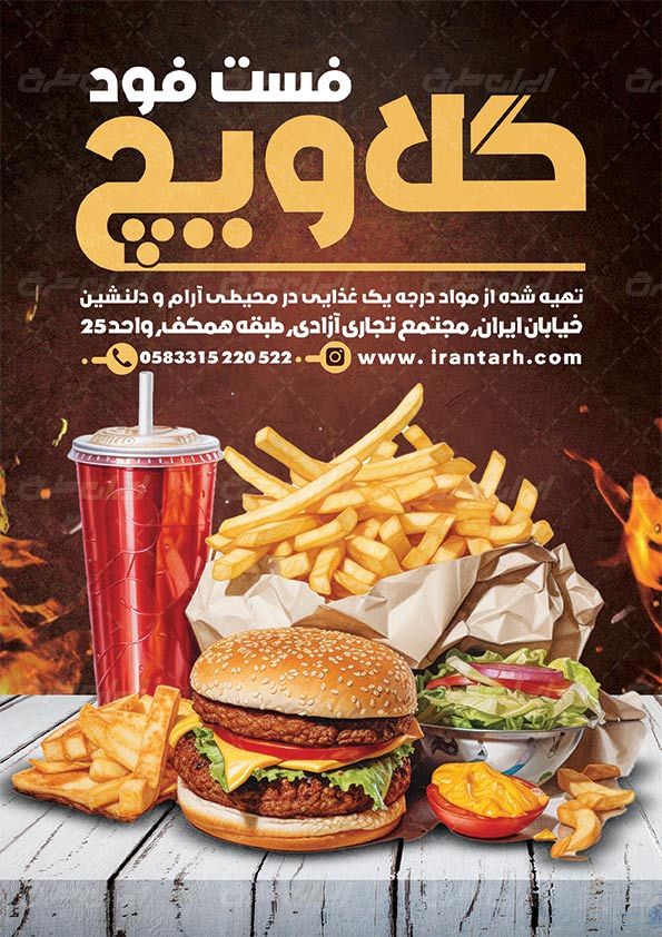 طرح تراکت فست فود شامل: عکس با کیفیت همبرگر ،تصویر مرتبط با طرح فست فود، فست فود، لیبل و شیپ های کاربردی می باشد که توسط طراحان ایران طرح در نرم افزار فتوشاپ طراحی شده است. به دلیل لایه باز بودن (قابل ویرایش توسط کاربران در نرم افزار فتوشاپ Adobe Photoshop) بودن و کیفیت بالای عناصر و المان های استفاده شده در طرح تراکت رنگی ، می توانید از این طرح علاوه بر چاپ تراکت(به صورت عمودی)، از سایر موارد تبلیغاتی از جمله نصب روی بیلبورد، استوری اینستاگرام و دیگر پلت فرم های فضای مجازی بهره ببرید.