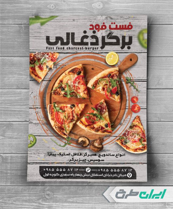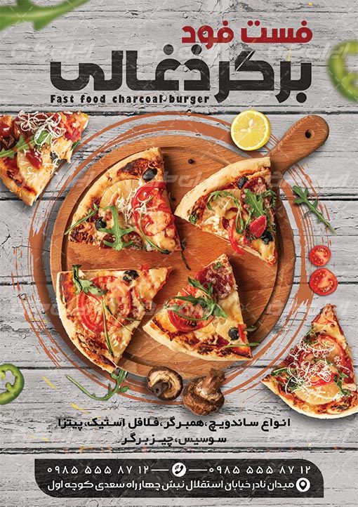 تراکت رنگی فست فودی ، طرح تراکت فست فودی ، تراکت فست فود ، طرح تراکت فست فود ، رستوران فست فود ، عکس با کیفیت پیتزا ،پیتزا فروشی ، لیبل و شیپ های کاربردی