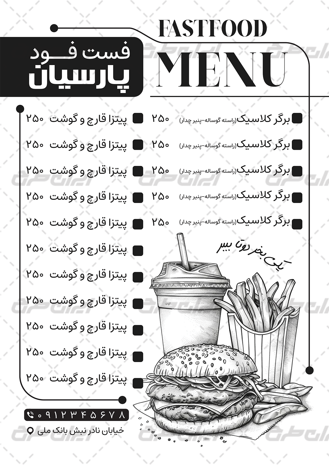 طرح تراکت سیاه و سفید اغذیه توسط تیم حرفه ای ایران طرح طراحی و در دسترس کاربران سایت قرار گرفته است.