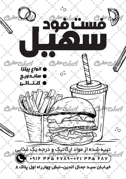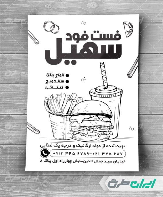 طرح تراکت سیاه و سفید اغذیه توسط تیم حرفه ای ایران طرح طراحی و در دسترس کاربران سایت قرار گرفته است.