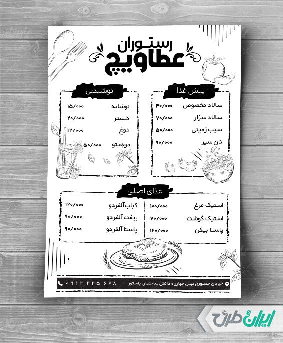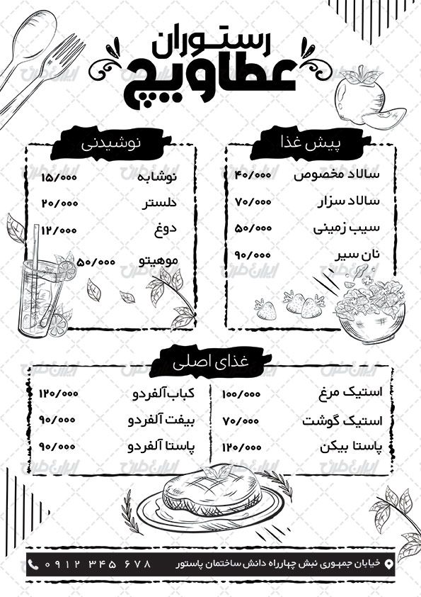 طرح تراکت سیاه و سفید اغذیه توسط تیم حرفه ای پارس گرافیک طراحی و در دسترس کاربران سایت قرار گرفته است.