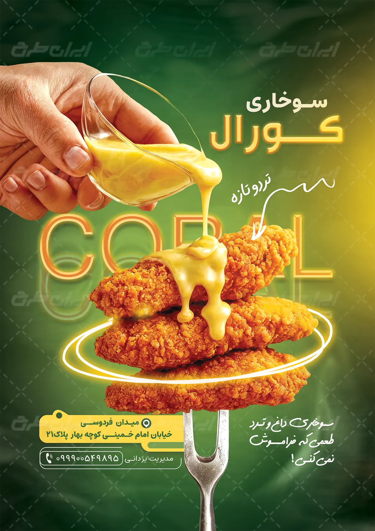 عکس مرغ سوخاری، تصویر مرتبط با طرح تراکت، فست فود، لیبل و شیپ های کاربردی می باشد که توسط طراحان ایران طرح در نرم افزار فتوشاپ طراحی شده است.