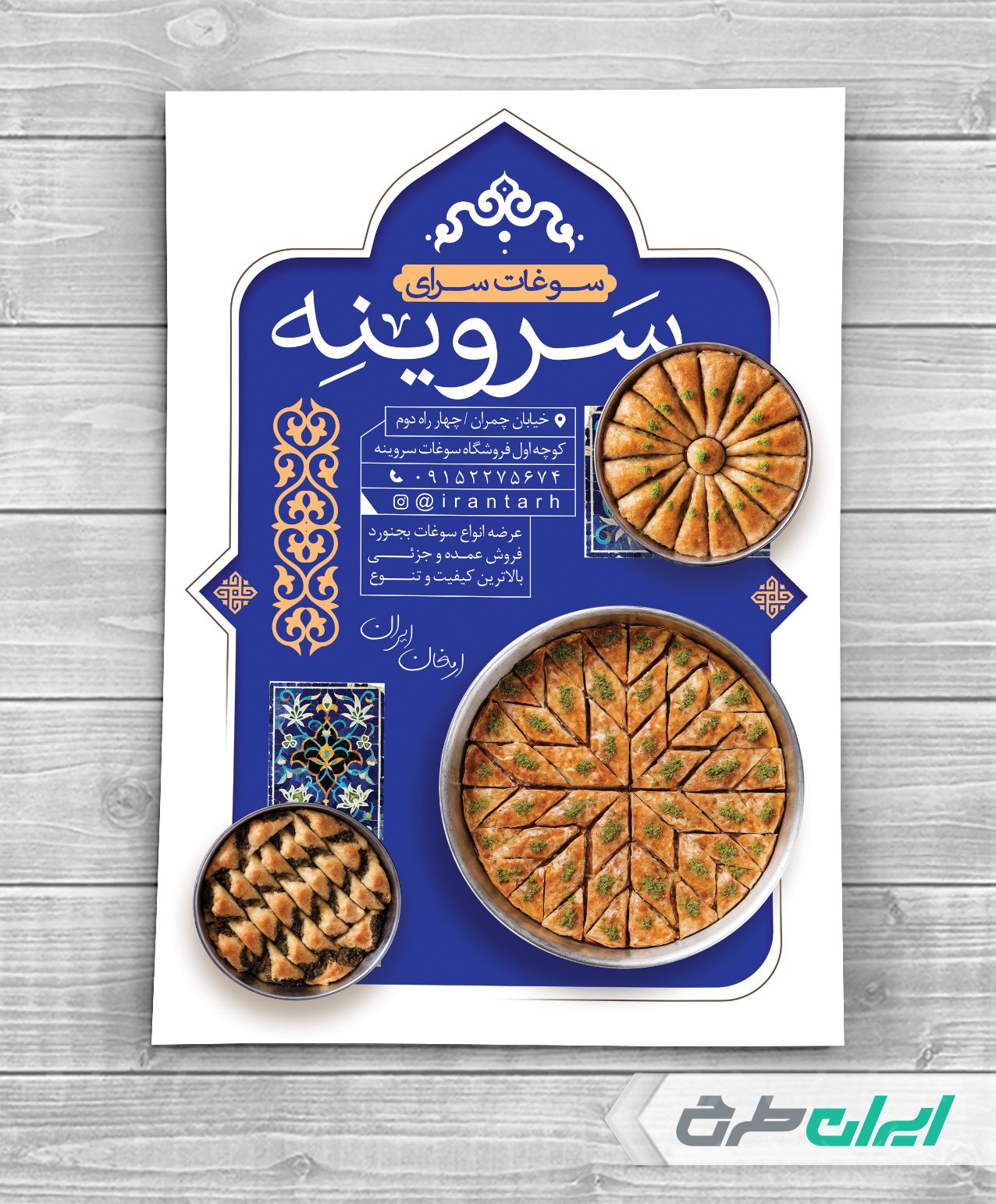 طرح تراکت لایه باز فروشگاه گز و سوهان، توسط تیم ایران طرح برای بازاریابی و تبلیغات این فروشگاه طراحی شده است.