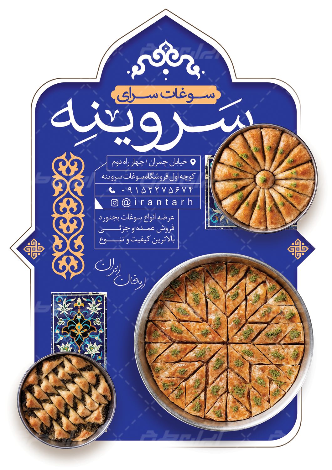- استفاده از عکس باکیفیت گز و سوهان که مناسب طرح تراکت سوغات سرا می باشد.