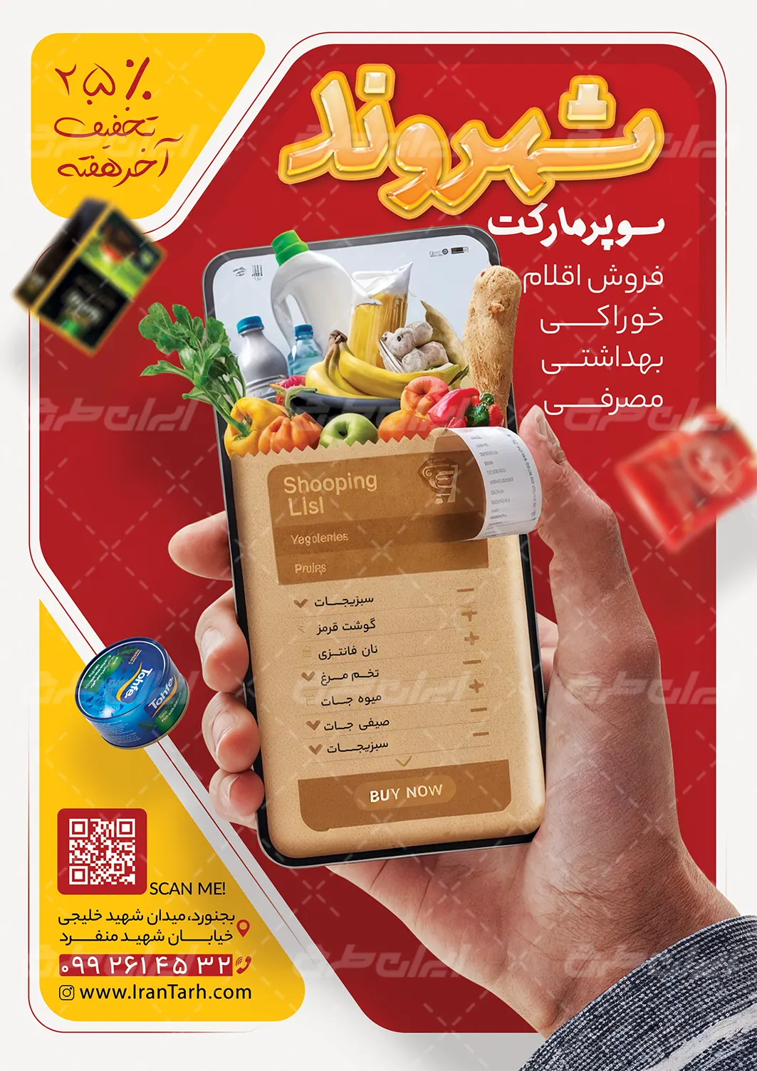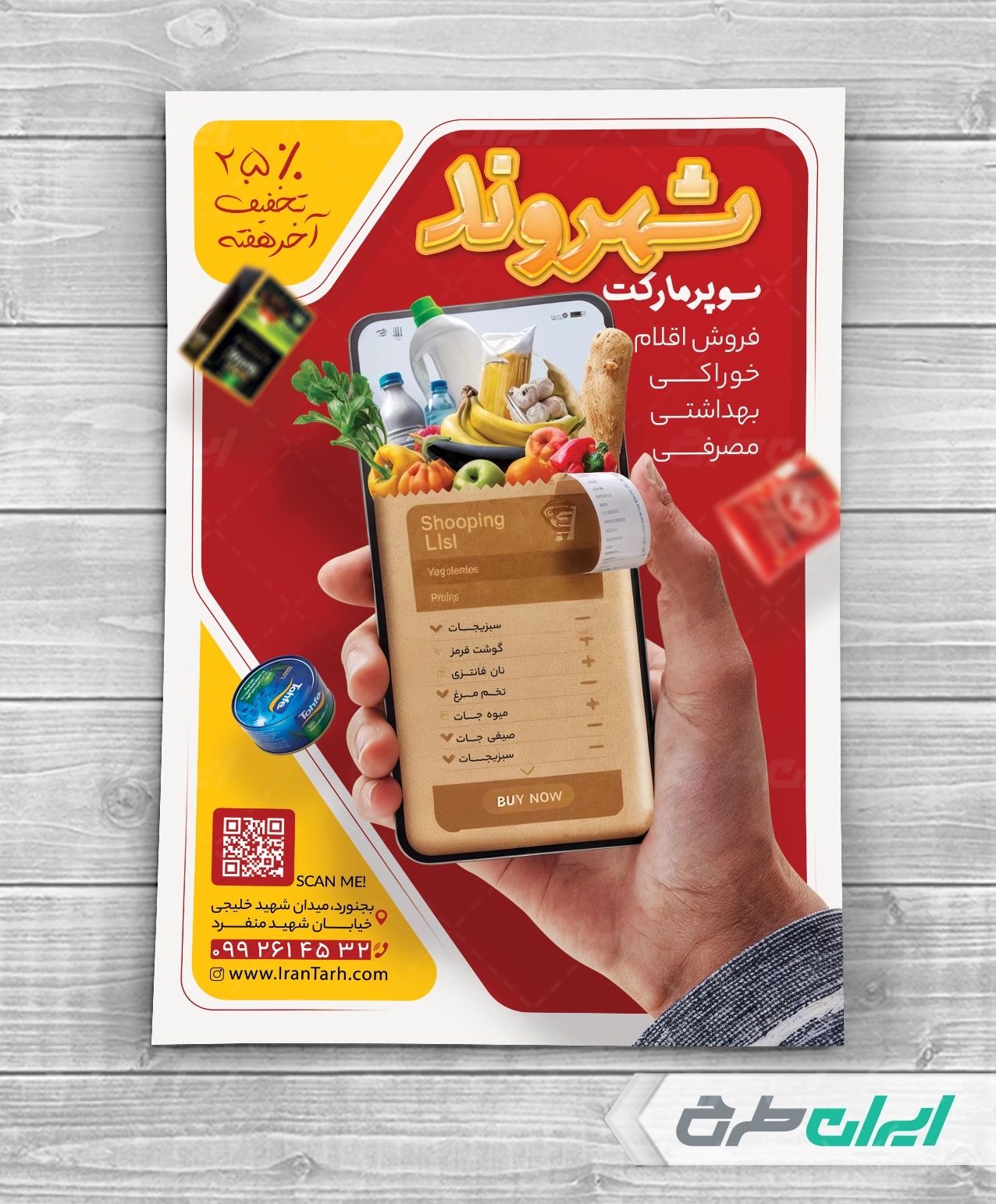 طرح تراکت لایه باز سوپر مارکت، توسط تیم ایران طرح برای بازاریابی و تبلیغات این فروشگاه طراحی شده است.