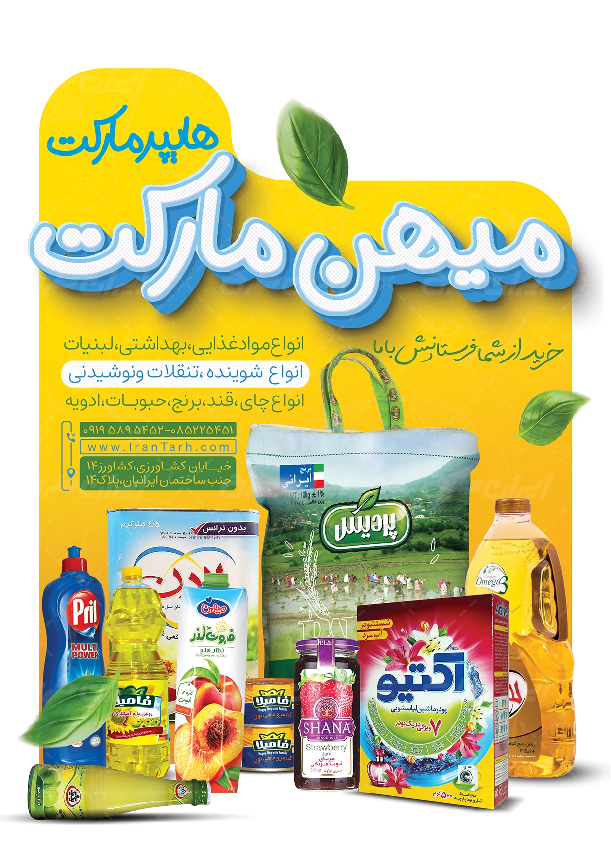 طرح تراکت لایه باز سوپر مارکت، توسط تیم ایران طرح برای بازاریابی و تبلیغات این فروشگاه طراحی شده است.