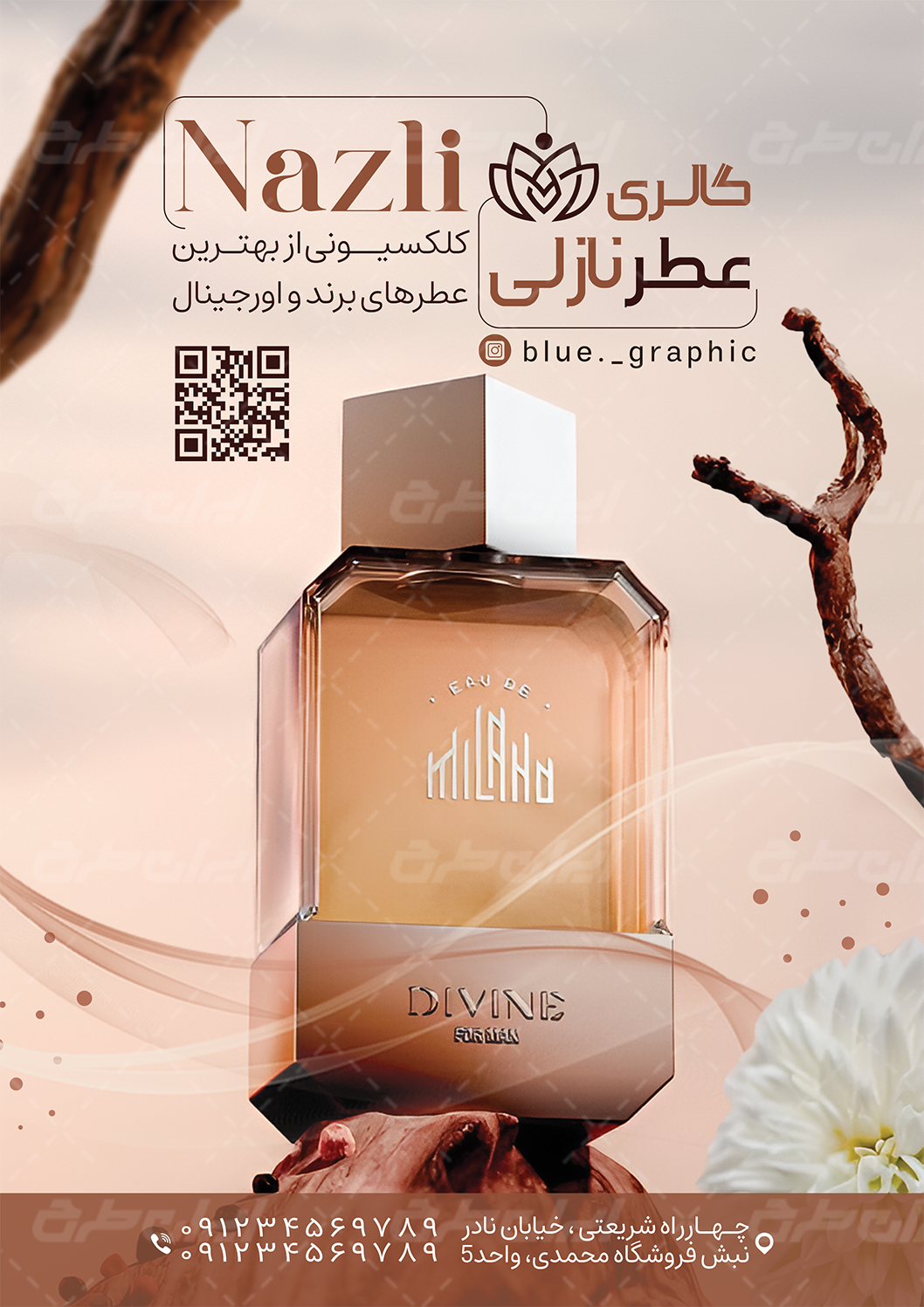 - استفاده مناسب از عکس باکیفیت شیشه عطر و ادکلن در طرح تراکت فروشگاه عطر