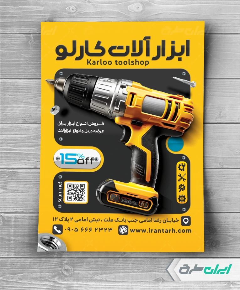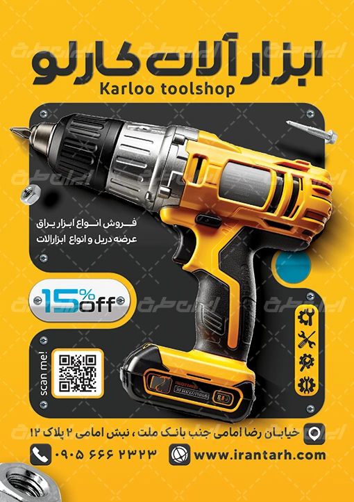 - استفاده از عکس باکیفیت ابزار یراق که مناسب با طرح تراکت لایه باز ابزار فروشی