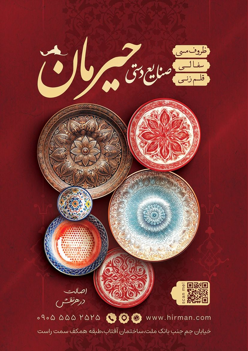 - هم نشینی مناسب رنگ قرمز با طرح تراکت ظروف مسی