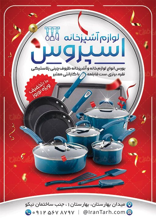 - هم نشینی مناسب رنگ قرمز با طرح تراکت لوازم آشپزخانه