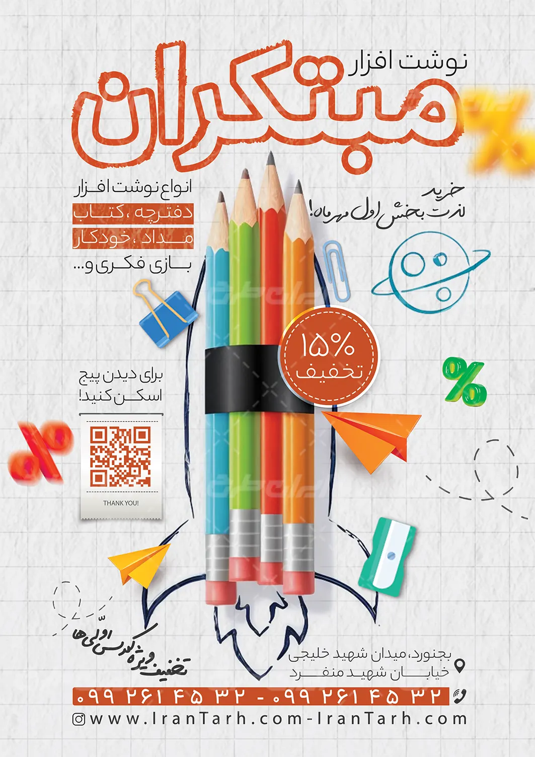 طرح تراکت لایه باز فروشگاه نوشت افزار، جهت بازاریابی و تبلیغات این دسته از فروشگاه ها توسط تیم طراحان ایران طرح طراحی و در دسترس کاربران سایت قرار گرفته است.