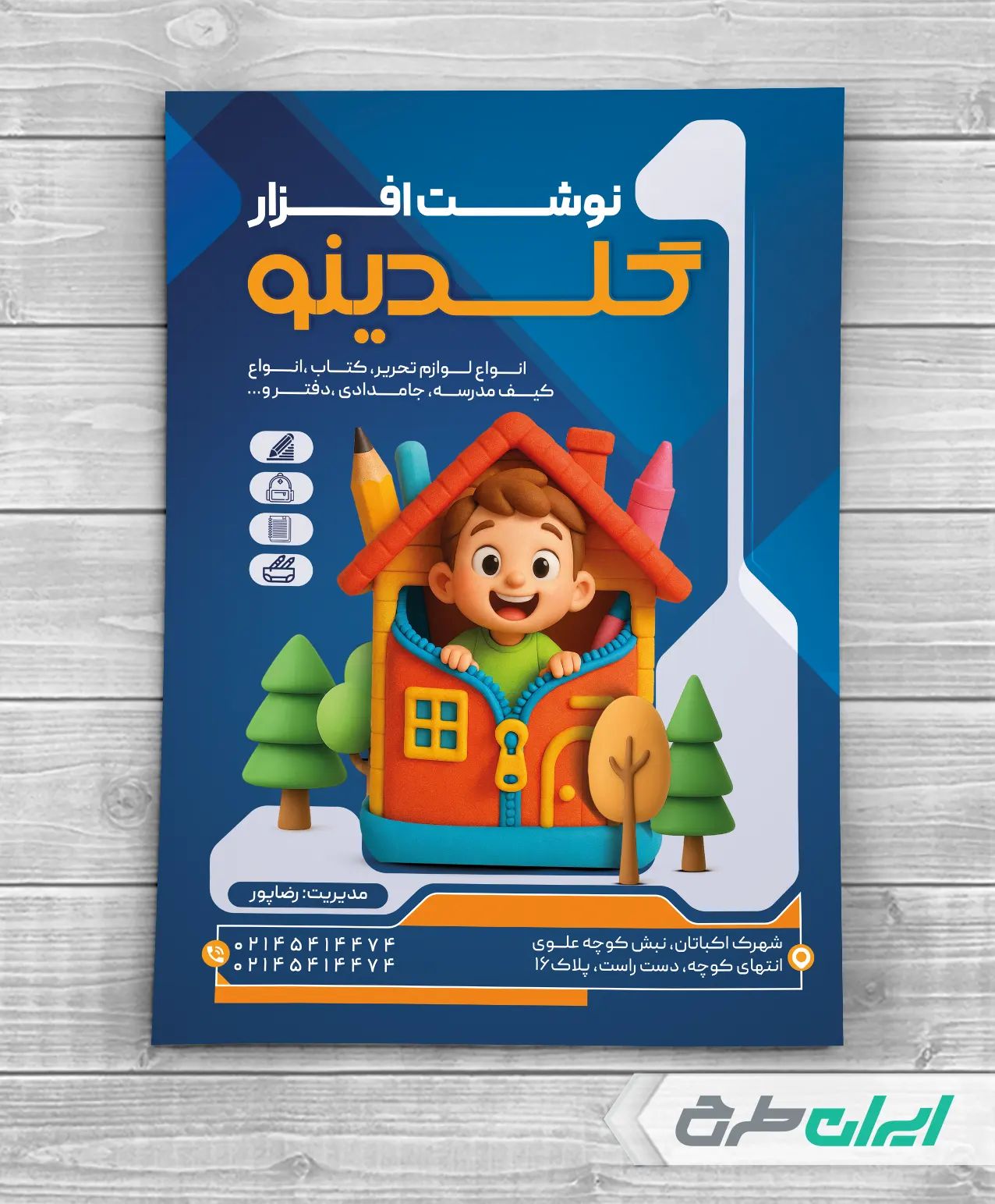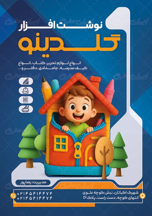 طرح تراکت لایه باز فروشگاه نوشت افزار، جهت بازاریابی و تبلیغات این دسته از فروشگاه ها توسط تیم طراحان ایران طرح طراحی و در دسترس کاربران سایت قرار گرفته است.