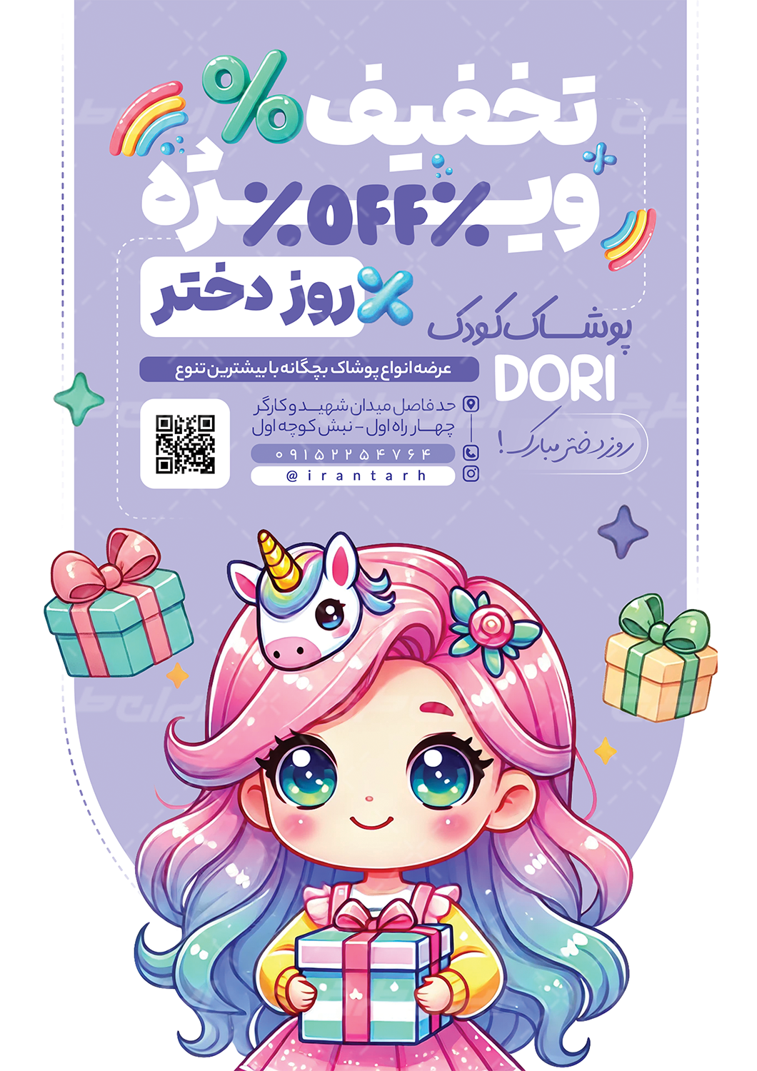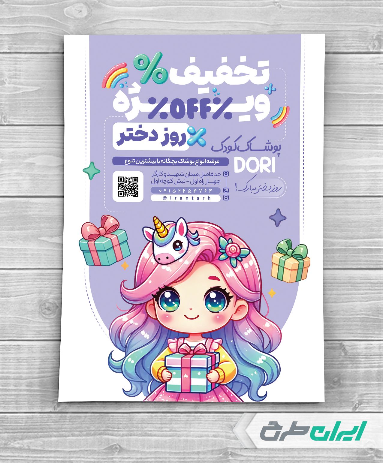 طرح تراکت گالری پوشاک کودک، جهت بازاریابی و تبلیغات این دسته از فروشگاه ها توسط تیم طراحان ایران طرح طراحی و در دسترس کاربران سایت قرار گرفته است.