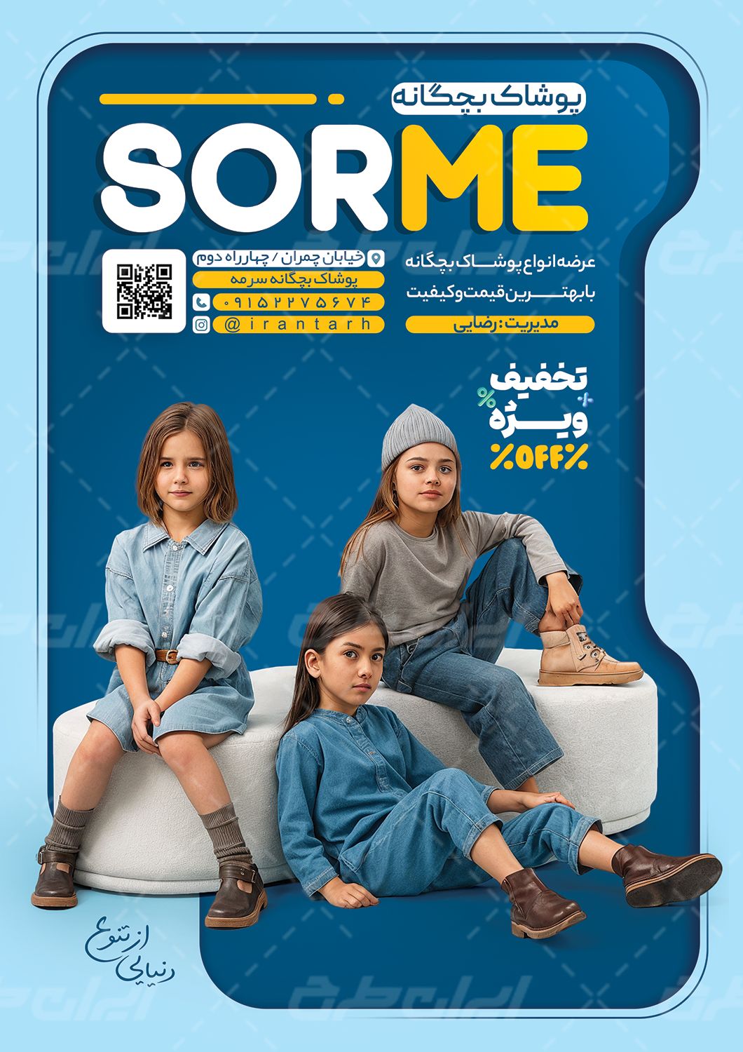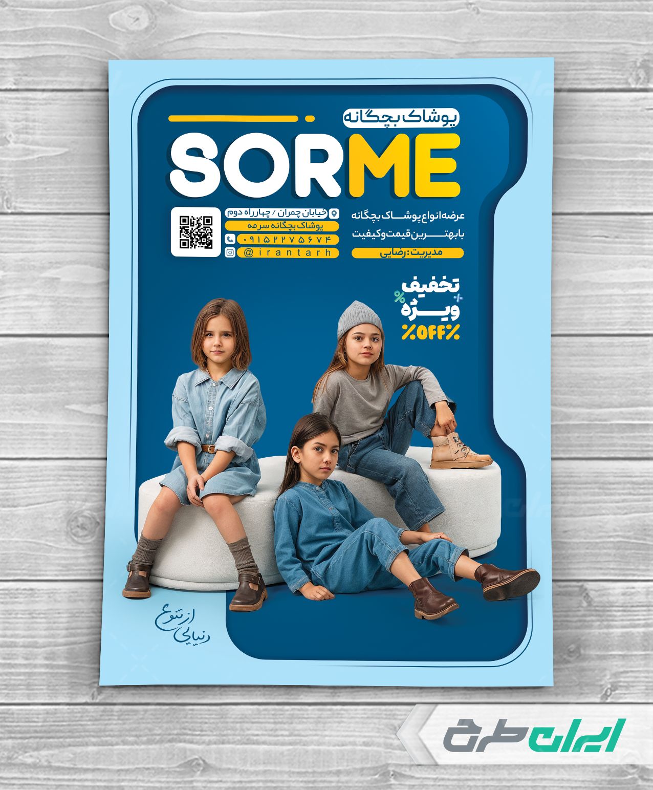 طرح تراکت گالری پوشاک کودک، جهت بازاریابی و تبلیغات این دسته از فروشگاه ها توسط تیم طراحان ایران طرح طراحی و در دسترس کاربران سایت قرار گرفته است.