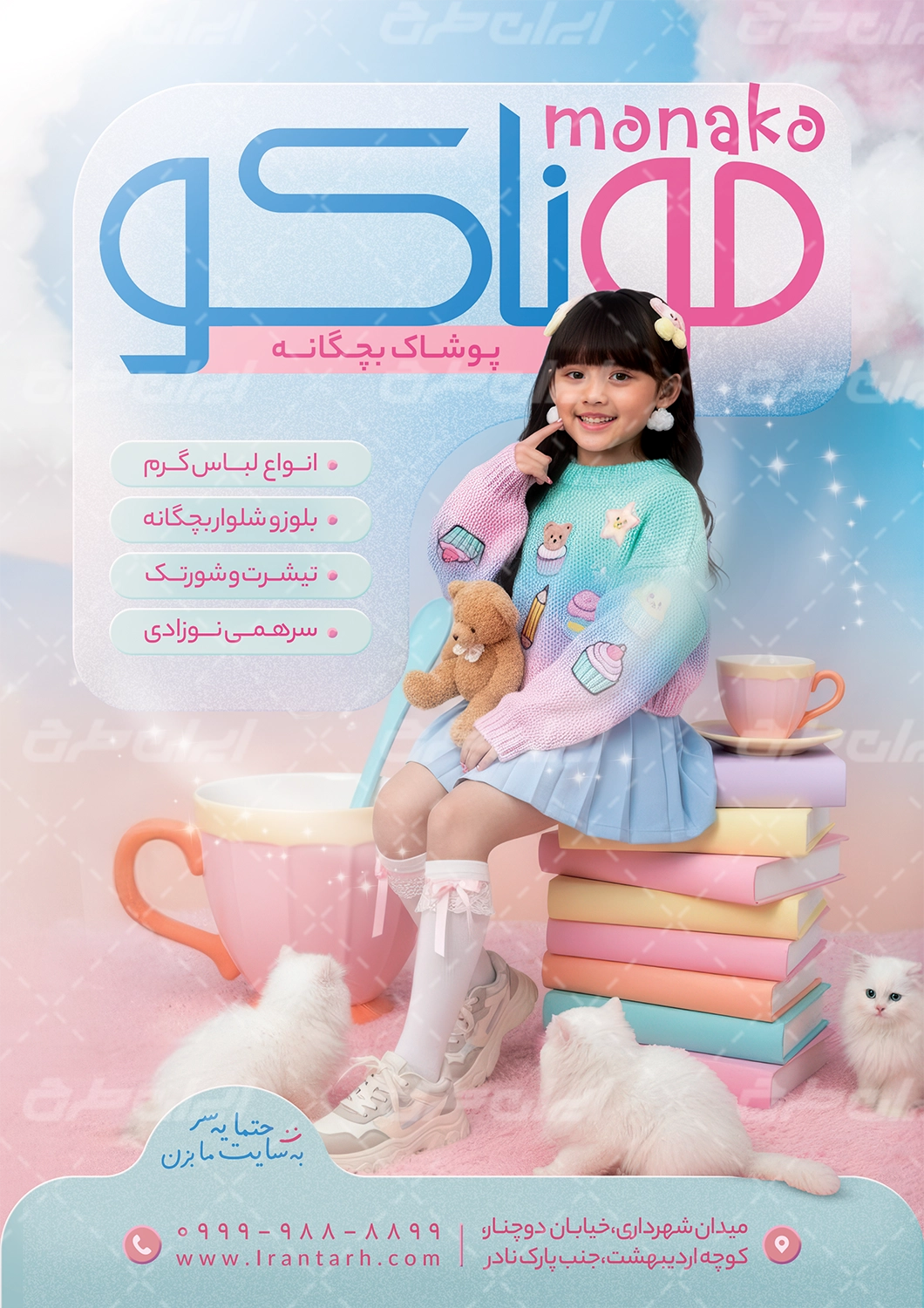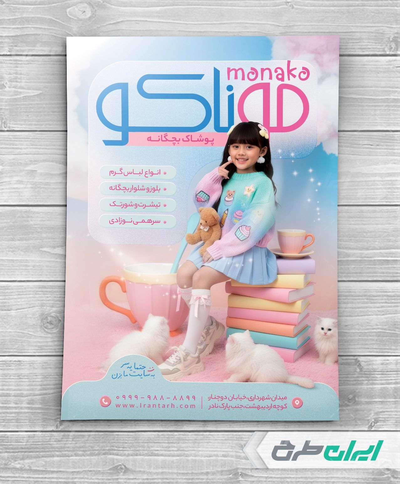 طرح تراکت گالری پوشاک کودک، جهت بازاریابی و تبلیغات این دسته از فروشگاه ها توسط تیم طراحان ایران طرح طراحی و در دسترس کاربران سایت قرار گرفته است.