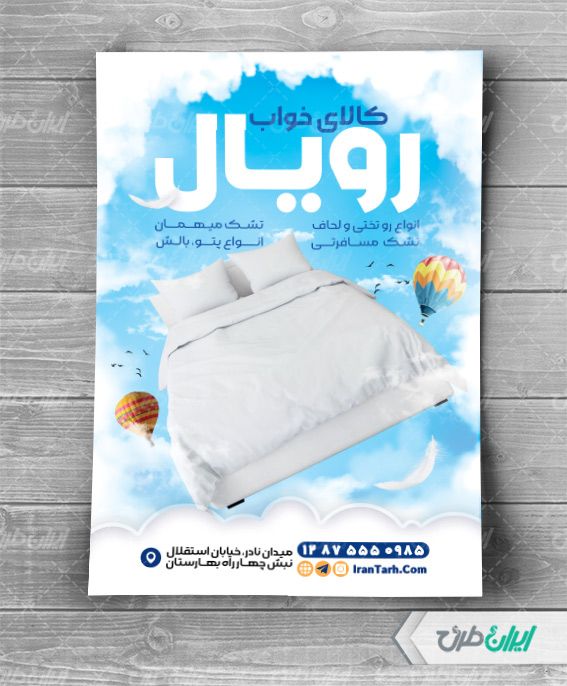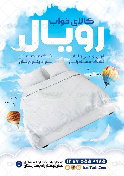 جذابیت بصری: طراحی تراکت با زمینه آبی و سفید میتواند بصریات آن را بهبود بخشد و جذابیت بیشتری برای مخاطبین فراهم کند. همچنین، افزودن تصاویر مرتبط با کالاهای خواب مانند تخت به طراحی، به جذب مشتریان کمک میکند.