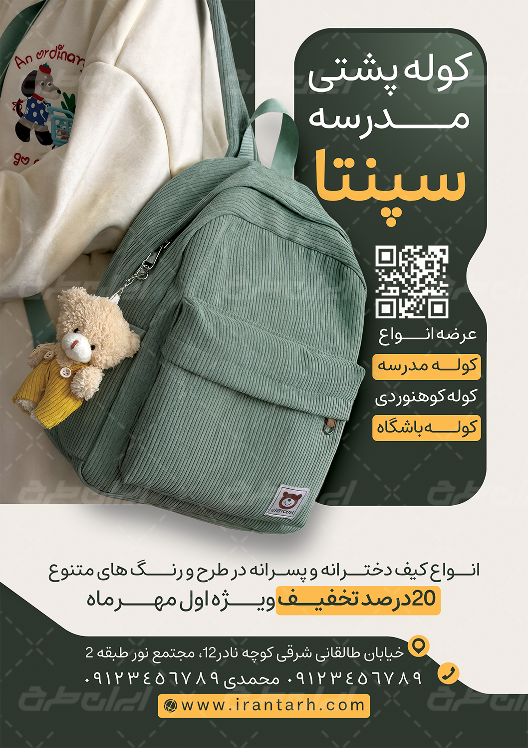 تصویر کیف مدرسه، وکتور، لیبل و شیپ های کاربردی می باشد که توسط طراحان ایران طرح در نرم افزار فتوشاپ طراحی شده است.