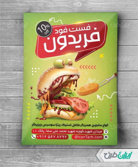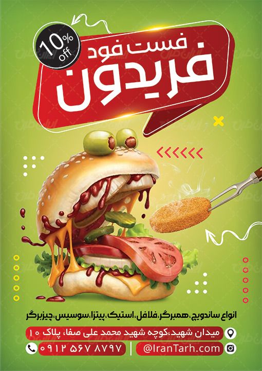 4- استفاده از فونت مناسب: در طراحی تراکت های فست فود، استفاده از فونت مناسب بسیار مهم است. در طرح لایه باز تراکت فست فود با زمینه سبز، از فونتی با حروف بزرگ و خوانا استفاده شده است که مخاطبان را به سمت اطلاعات مهم در تراکت هدایت می کند.