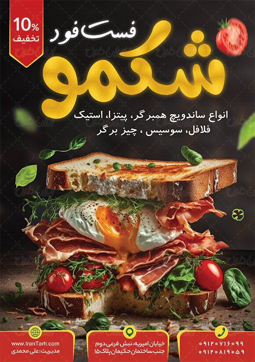 طراحی تراکت به عنوان یکی از ابزارهای تبلیغاتی میتواند در بهبود کسبوکار فست فود بسیار موثر باشد. در ادامه توضیح داده میشود که چگونه یک تراکت با طرح لایه باز با زمینه مشکی و عکس ساندویچ میتواند به بهبود کسبوکار کمک کند.