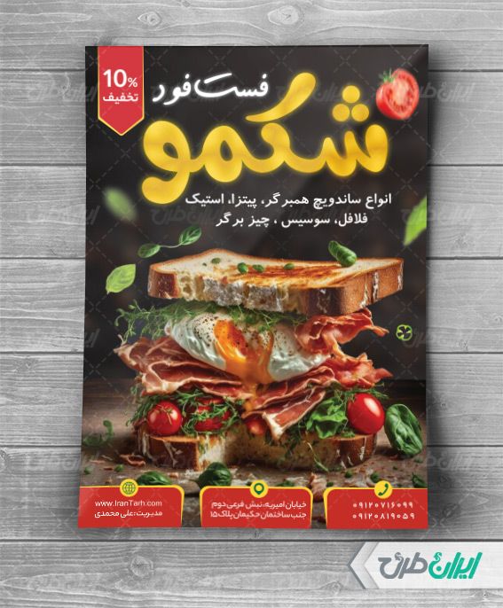 جذب مشتری: طراحی تراکت با زمینه مشکی و عکس ساندویچ باعث جذب نگاه مشتریان میشود. زمینه مشکی بهعنوان یک رنگ قدرتمند و جذاب به مشتریان اطمینان و اعتماد را القا میکند و همچنین عکس ساندویچ بهعنوان یک تصویر واضح و آراسته در ذهن مشتری برجسته میشود.