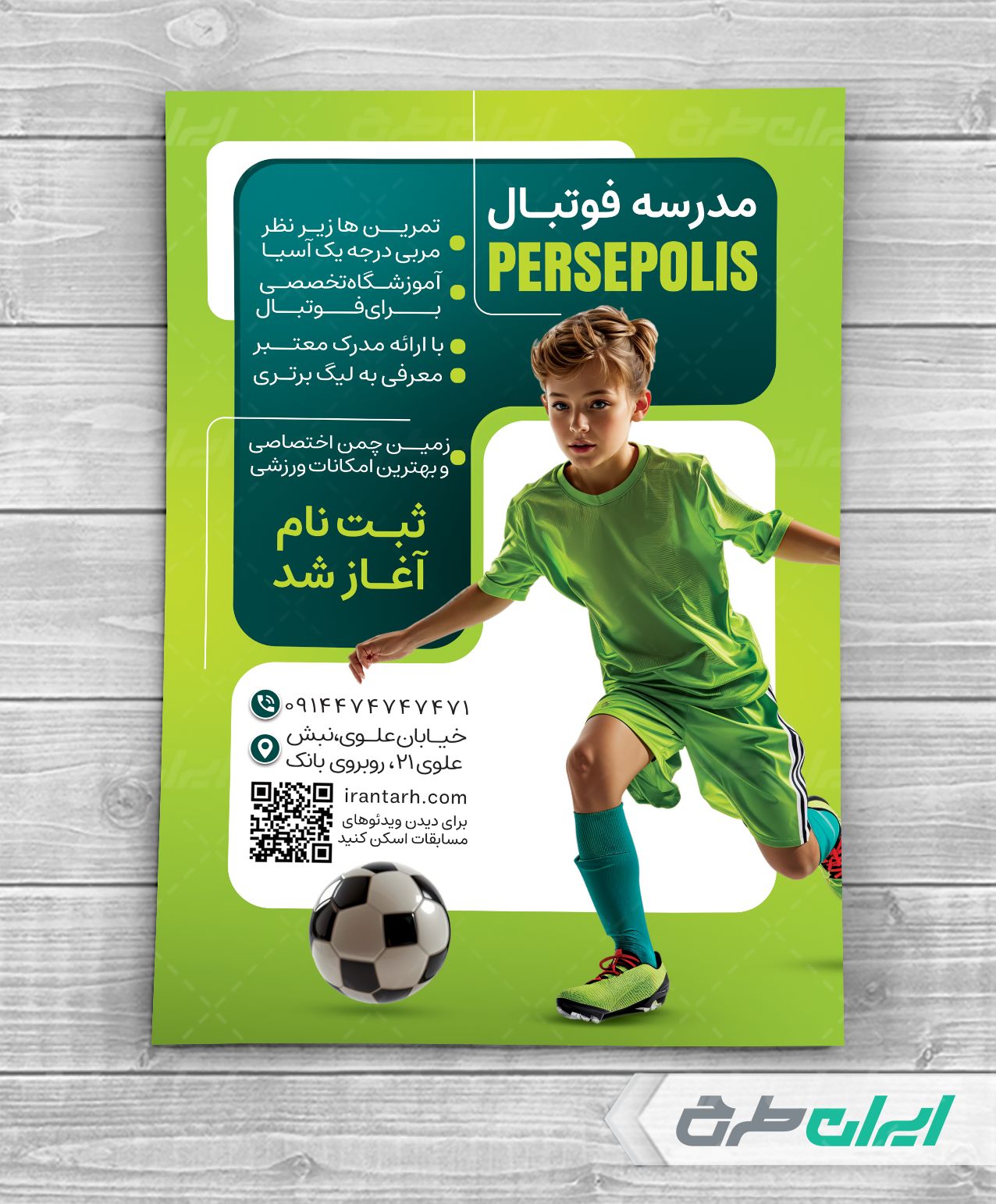 طرح تراکت لایه باز مدرسه فوتبال، جهت بازاریابی و تبلیغات این کلاس ها توسط ایران طرح طراحی و در اختیار کاربران سایت قرار گرفته است.