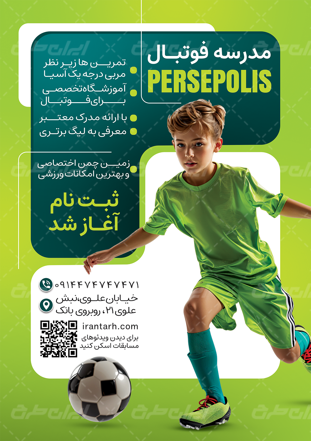 - استفاده مناسب از تصویر فوتبالیست و توپ در طرح تراکت مدرسه فوتبال
