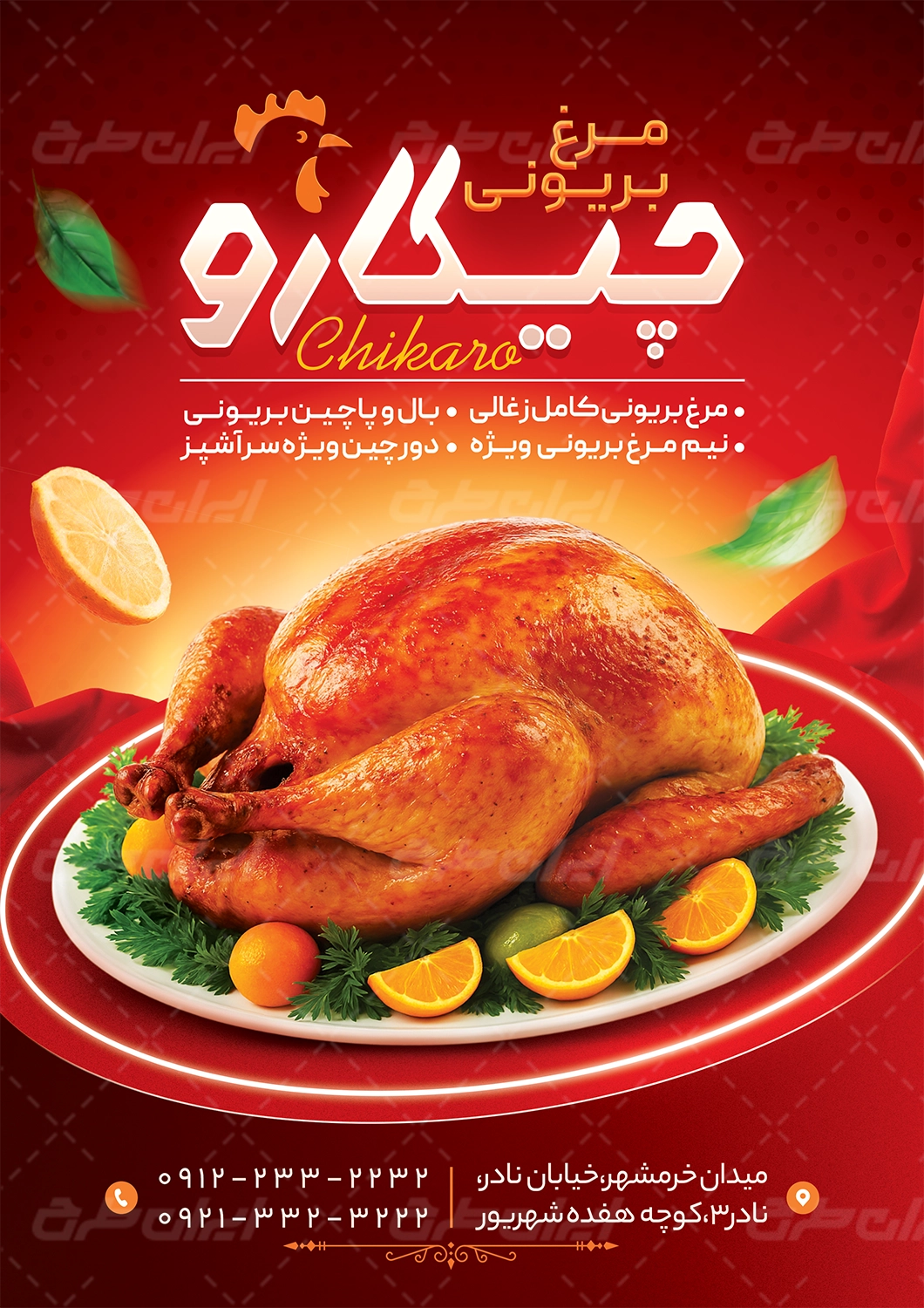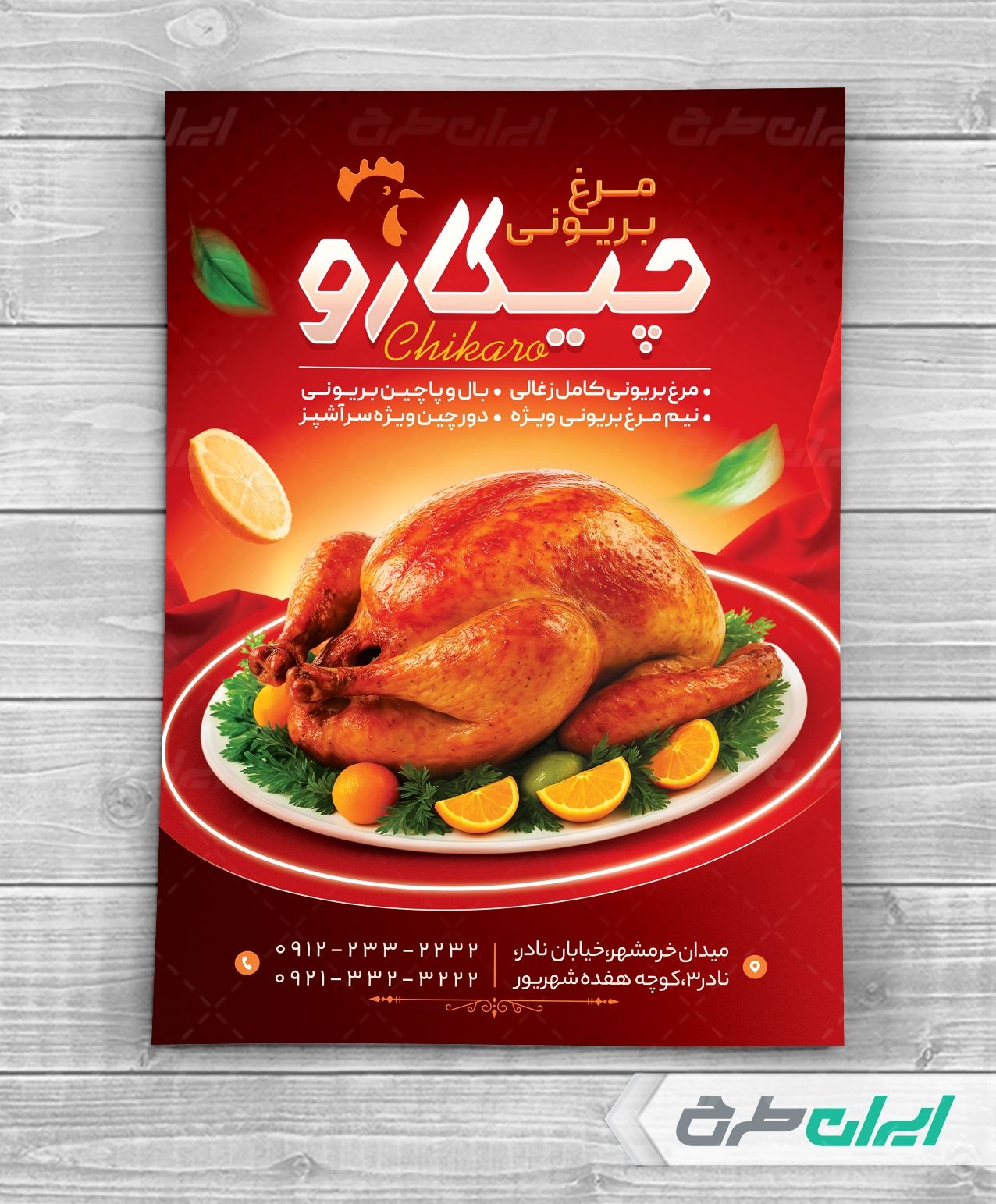 - استفاده از عکس باکیفیت مرغ بریان که مناسب طرح تراکت رستوران می باشد.