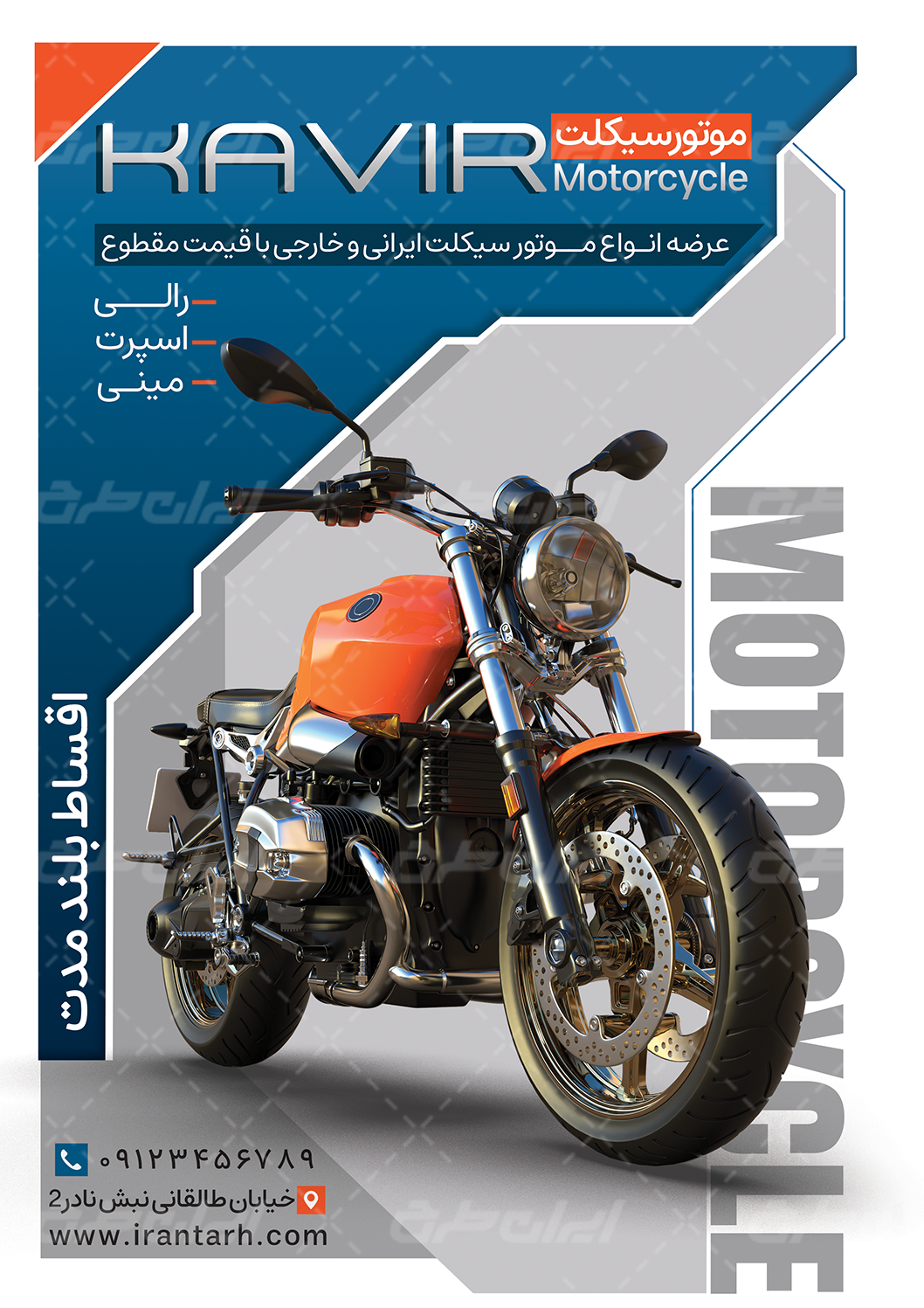 طرح لایه باز تراکت فروشگاه موتور سیکلت، توسط تیم ایران طرح جهت تبلیغات و بازاریابی این مشاغل طراحی و در دسترس کاربران سایت قرار گرفته است.