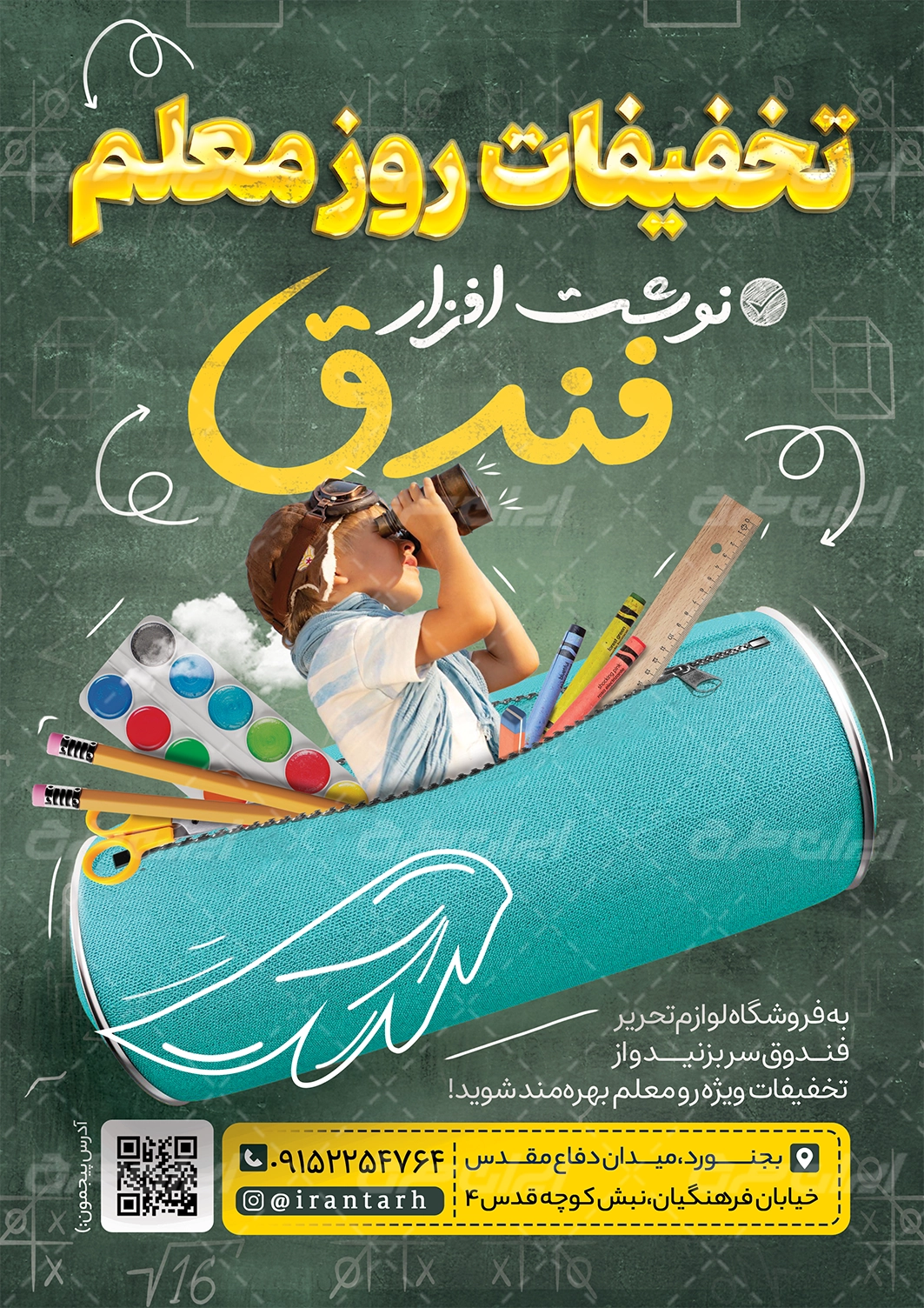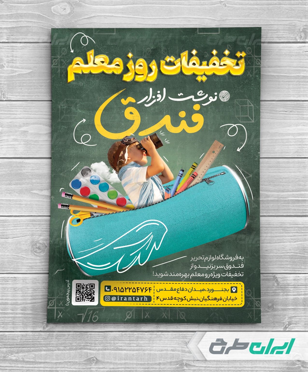 طرح تراکت لایه باز فروشگاه نوشت افزار، جهت بازاریابی و تبلیغات این دسته از فروشگاه ها توسط تیم طراحان ایران طرح طراحی و در دسترس کاربران سایت قرار گرفته است.