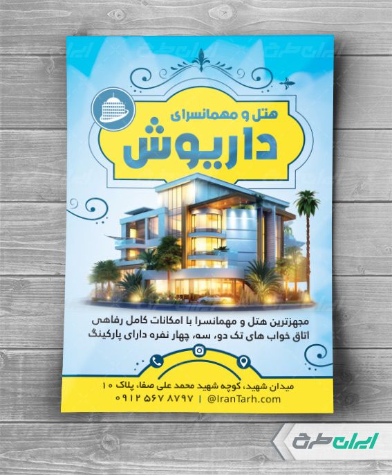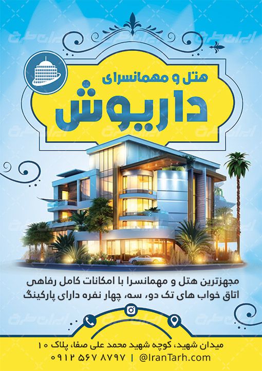 - استفاده از عکس باکیفیت هتل و مهمانسرا که مناسب طرح تراکت هتل و مهمانسرا می باشد.