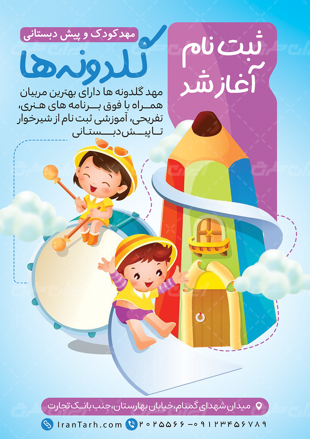 طرح تراکت لایه باز مهدکودک و پیش دبستانی جهت تبلیغات و بازاریابی این دسته از مشاغل توسط تیم ایران طرح طراحی شده است.