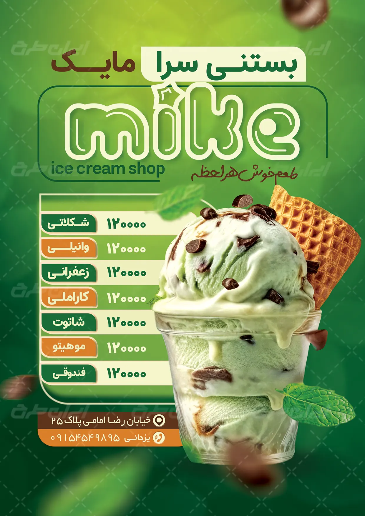 طرح تراکت بستنی فروشی، جهت بازاریابی و تبلیغات این دسته از مغازه ها توسط تیم طراحان ایران طرح طراحی و در دسترس کاربران سایت قرار گرفته است.