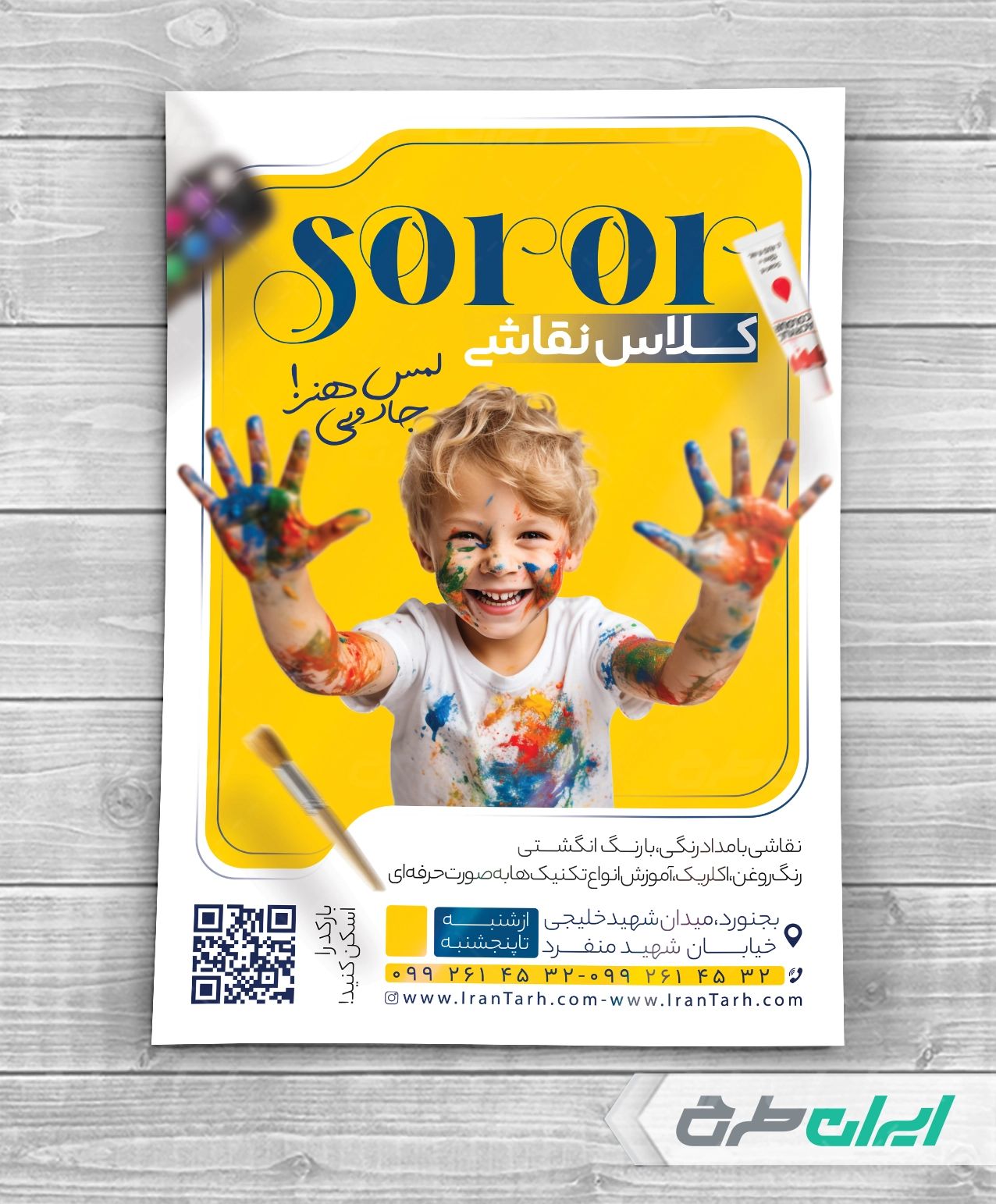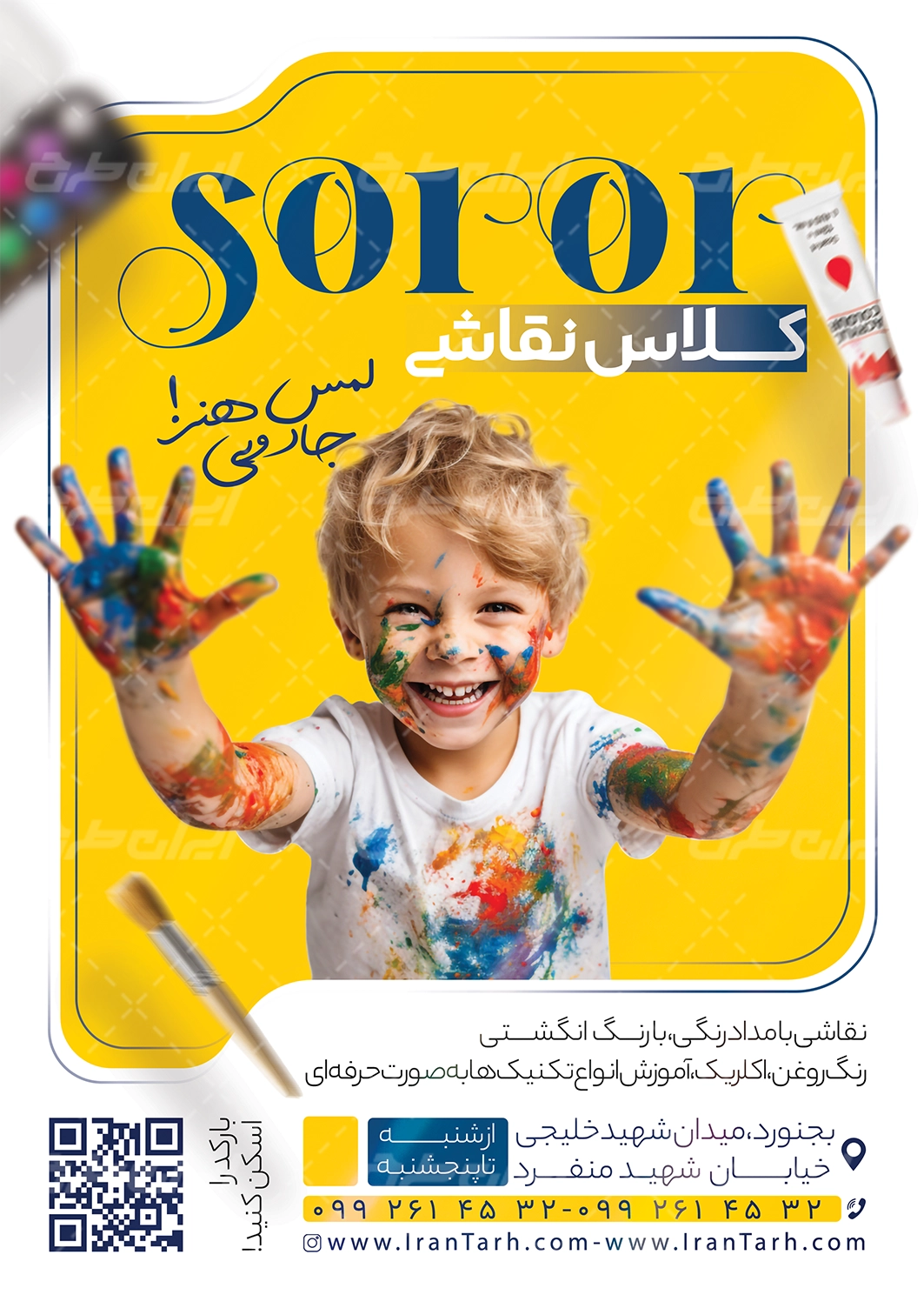 - استفاده از عکس با کیفیت و تصویر پسربچه در طرح تراکت آموزشگاه نقاشی می باشد.