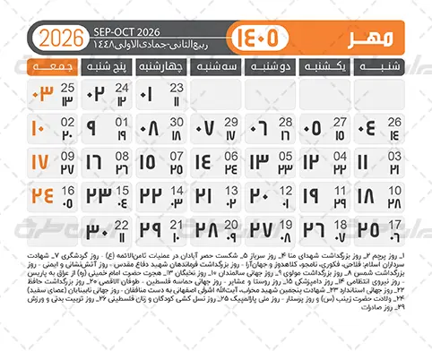 جدول بندی ماه های سال، ایام هفته، شمارش روز ها، مناسبت های شمسی و قمری، مناسبت های ملی و جهانی، لیبل ها و شیپ های کاربردی می باشد که به صورت لایه باز در نرم افزار فتوشاپ طراحی شده است.