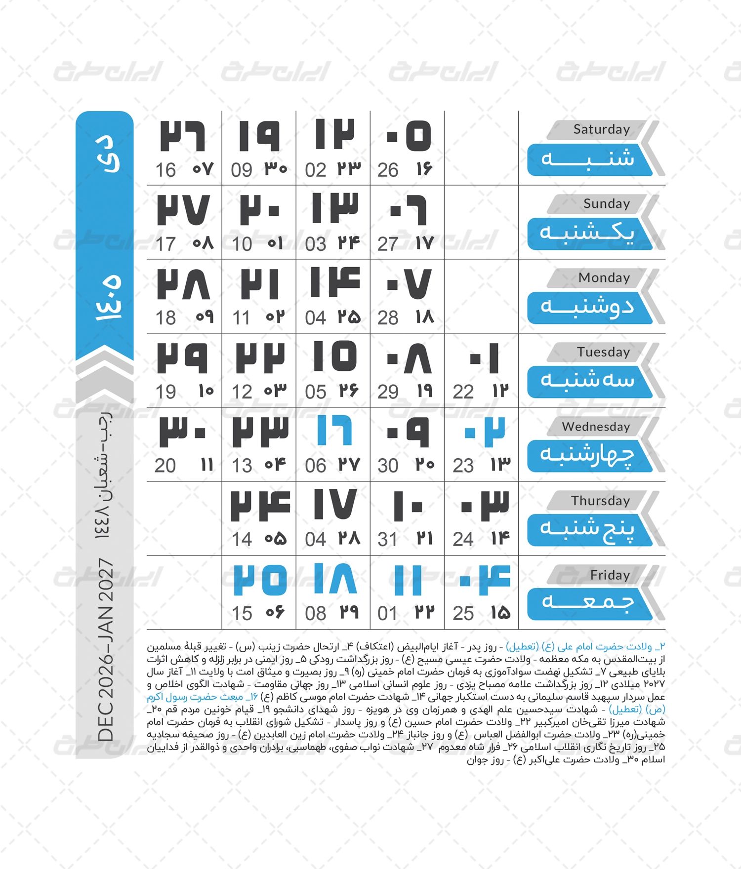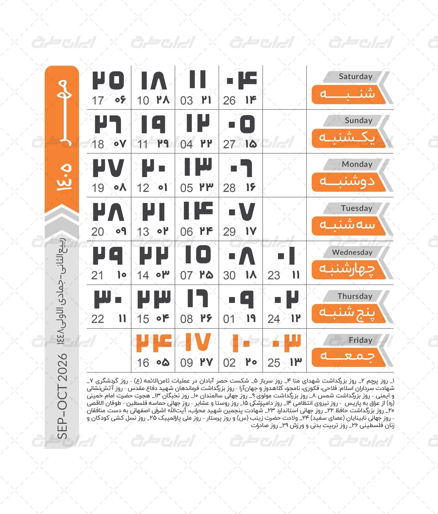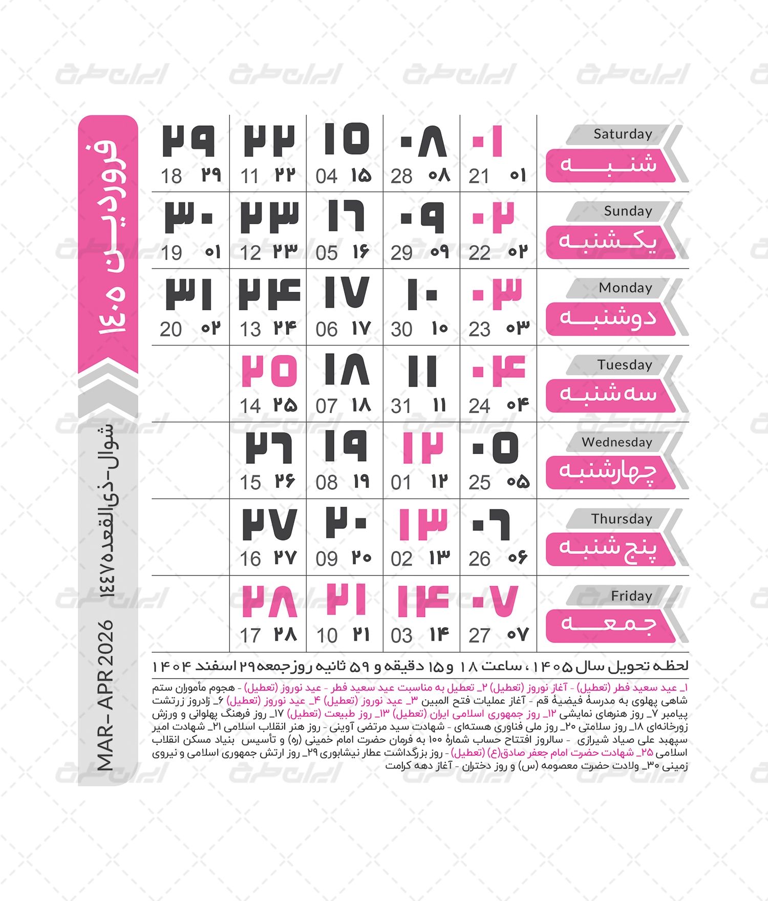 مشخصات طرح تقویم سال 1405