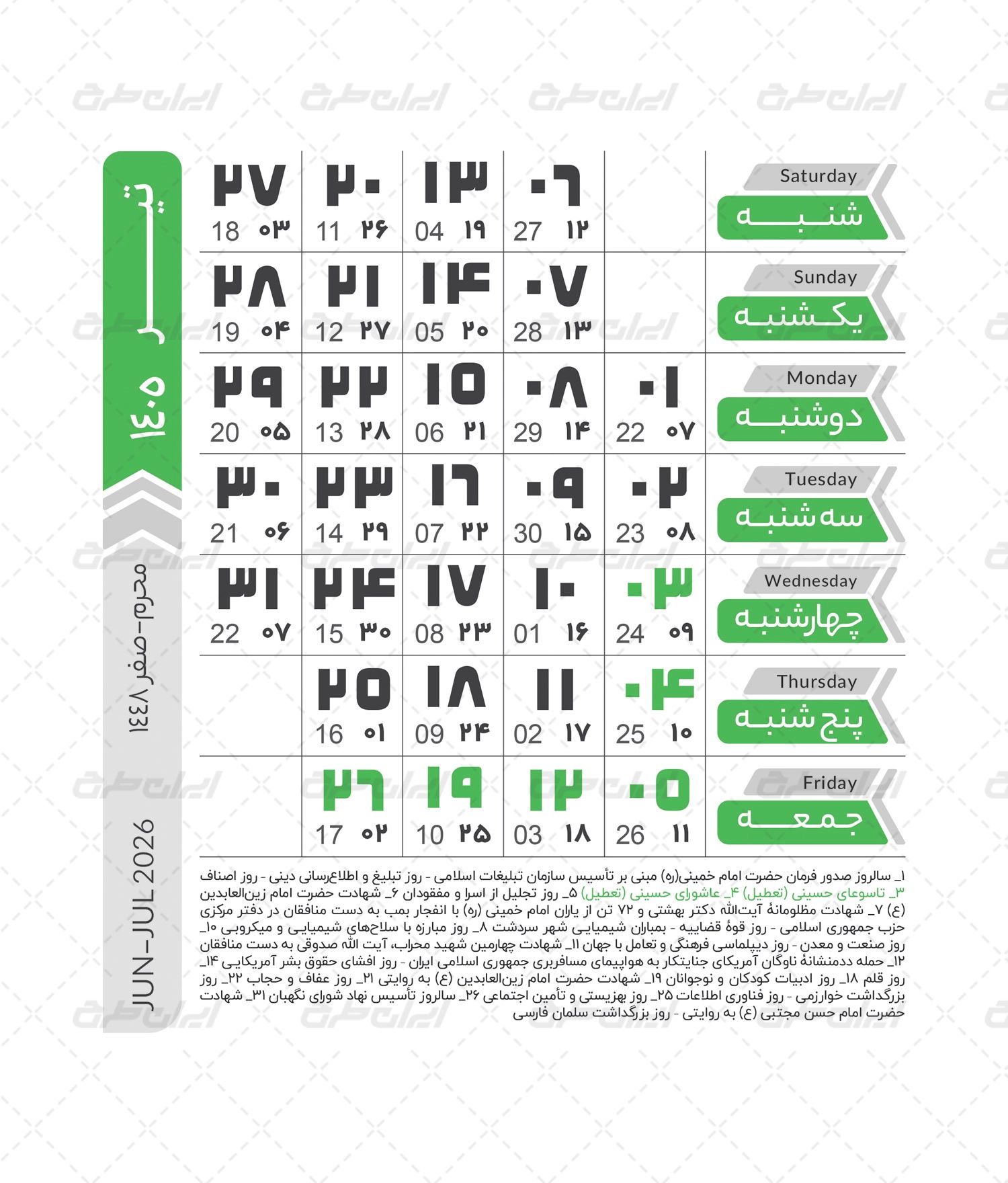 جدول بندی ماه های سال، ایام هفته، شمارش روز ها، مناسبت های شمسی و قمری، مناسبت های ملی و جهانی، لیبل ها و شیپ های کاربردی می باشد که به صورت لایه باز در نرم افزار فتوشاپ طراحی شده است.
