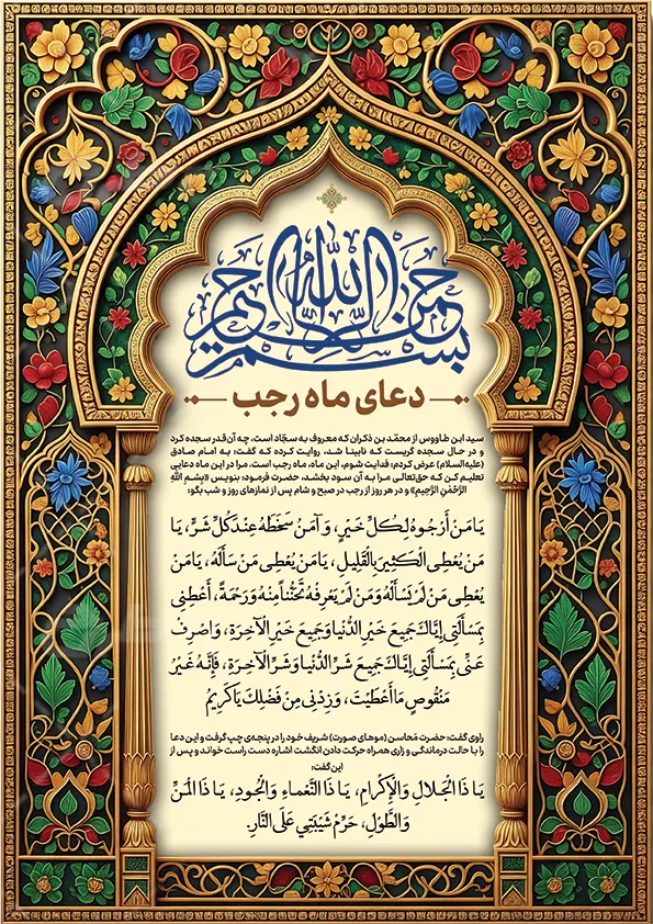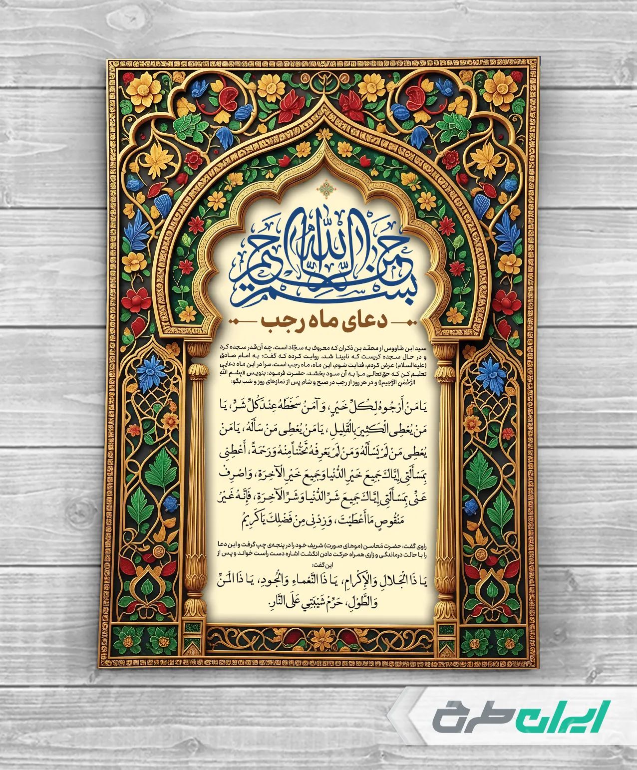متن دعای ماه رجب، تذهیب، نقوش مذهبی می باشد که توسط تیم ایران طرح طراحی شده است.