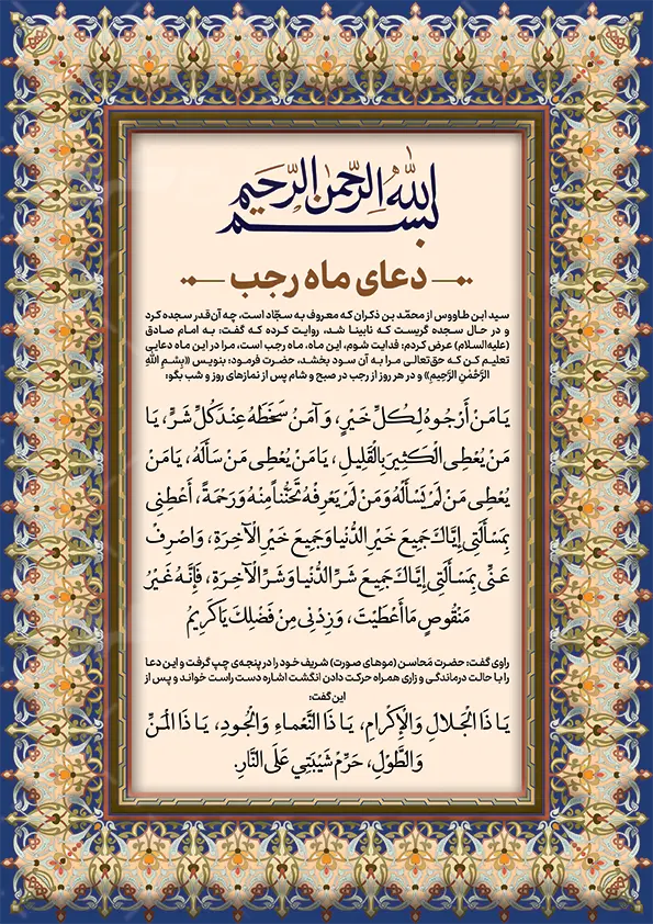 متن دعای ماه رجب، تذهیب، نقوش مذهبی می باشد که توسط تیم ایران طرح طراحی شده است.