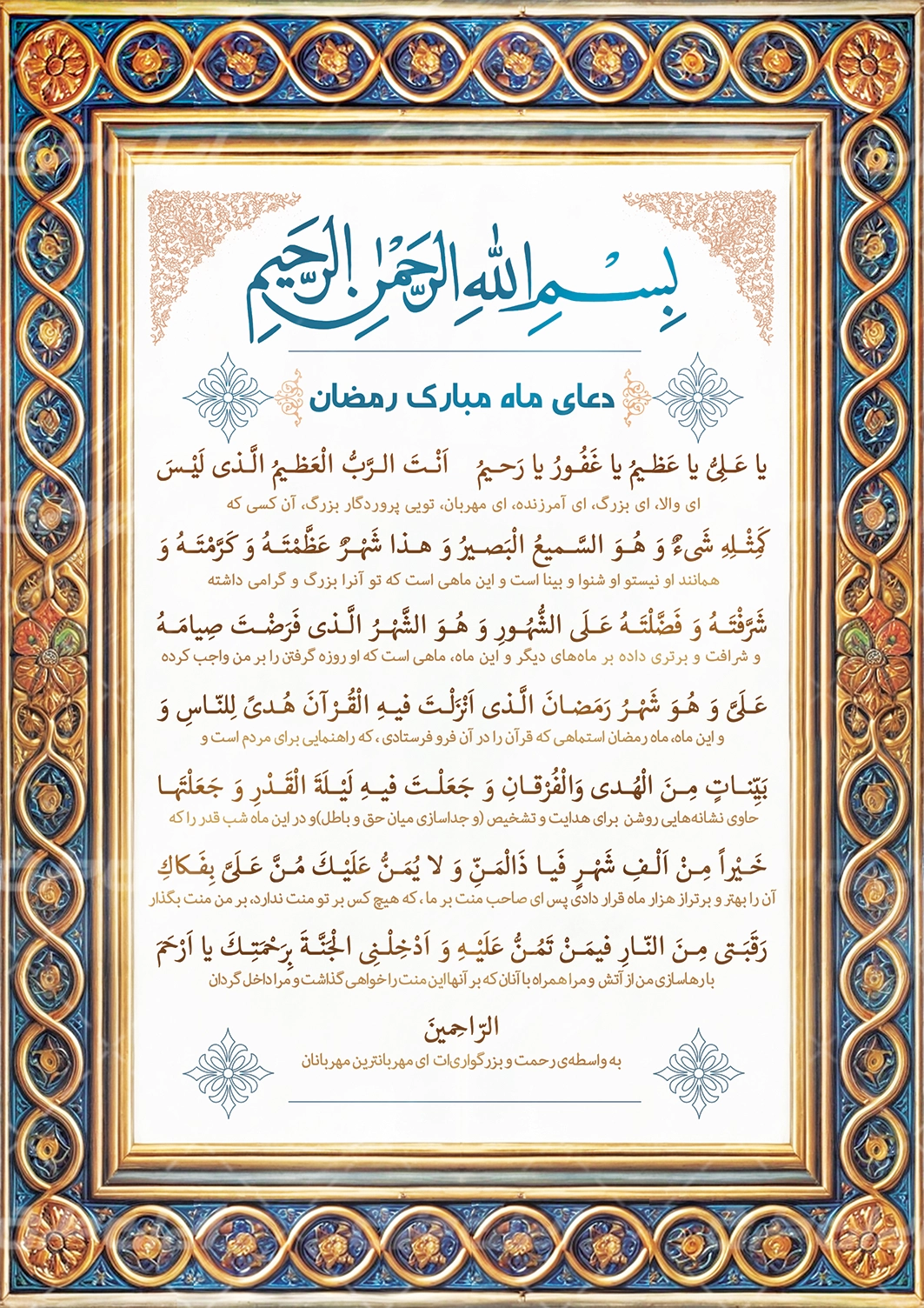 متن دعای روز اول ماه رمضان، طرح گل، تذهیب، نقوش مذهبی می باشد که توسط تیم ایران طرح طراحی شده است.