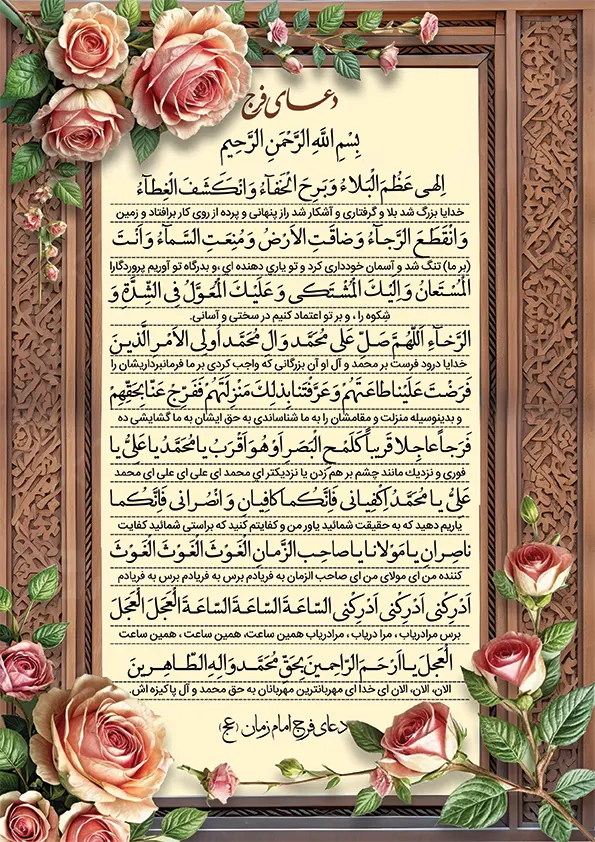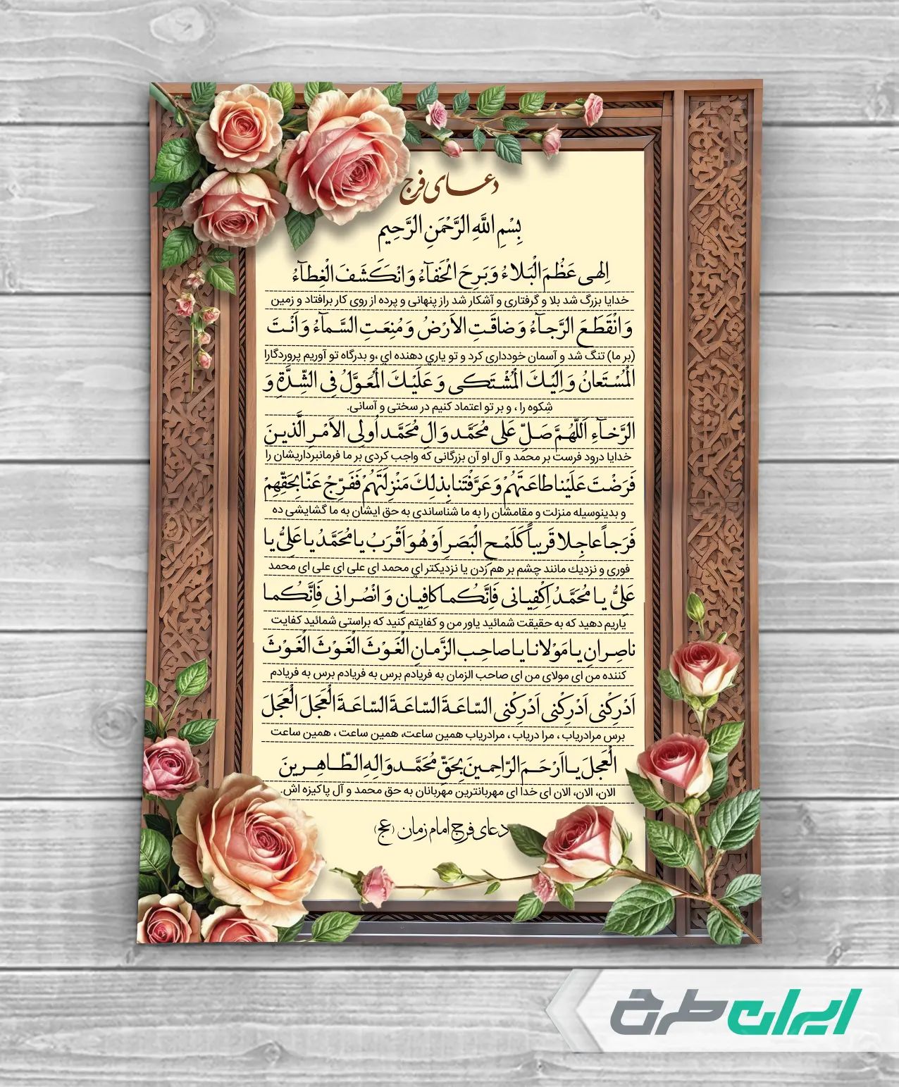 طرح بنر دعای فرج شامل: متن دعای فرج ، طرح گل ، تذهیب ، نقوش مذهبی می باشد که توسط تیم ایران طرح طراحی شده است.