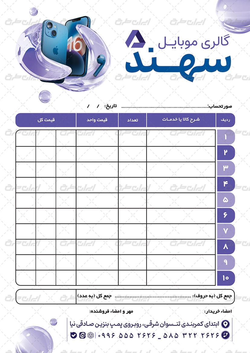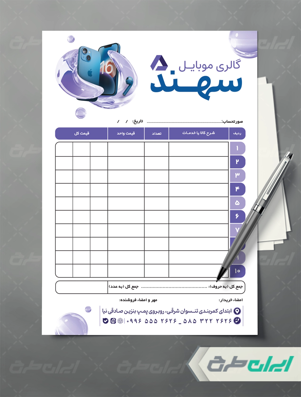 طرح لایه باز فاکتور موبایلفروشی ابزاری حیاتی در فرآیند فروش و تبلیغات است که به فروشندگان این امکان را میدهد تا به راحتی فاکتورها را با طراحی جذاب و حرفهای ایجاد کنند.