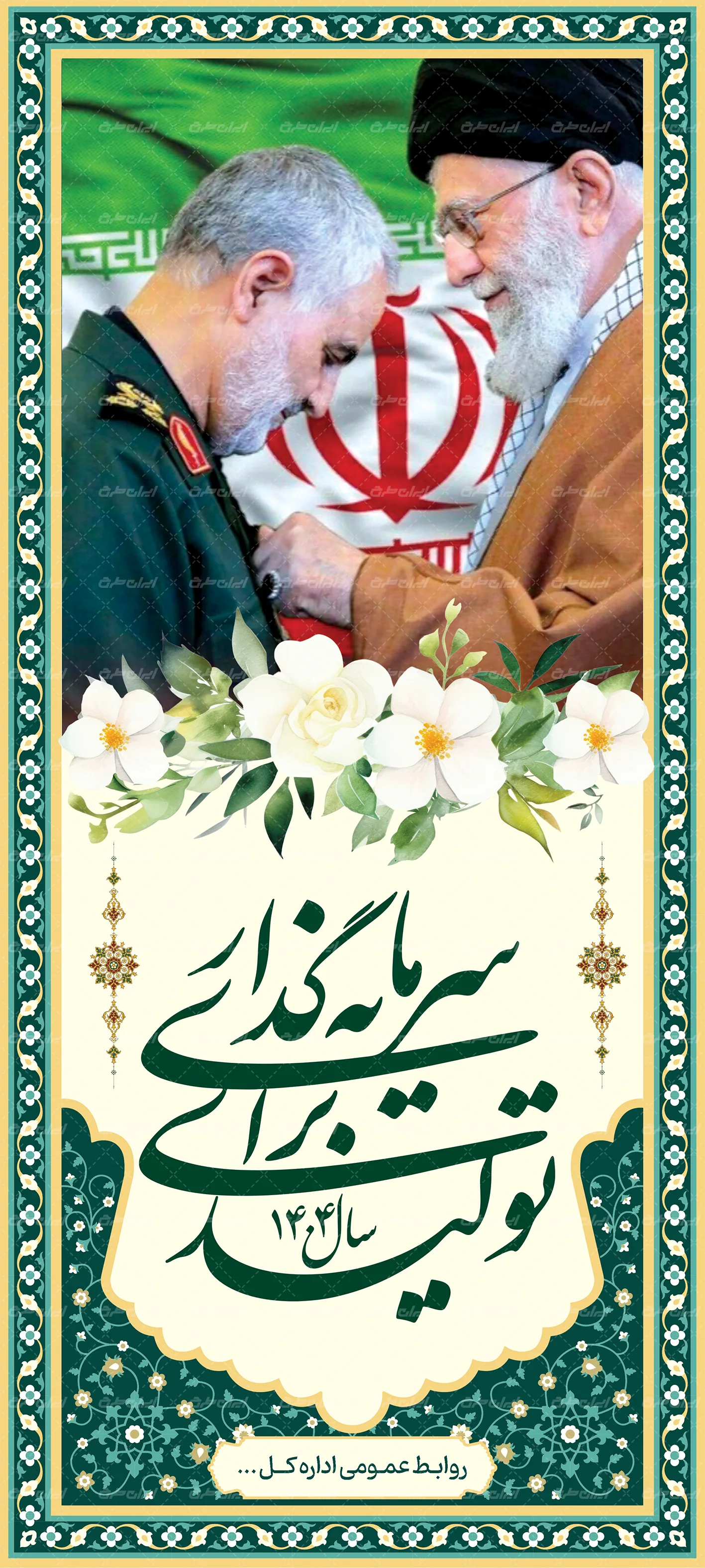 تصویر رهبری و متن شعار سال سرمایه گذاری برای تولید، که توسط تیم ایران طرح طراحی شده است.