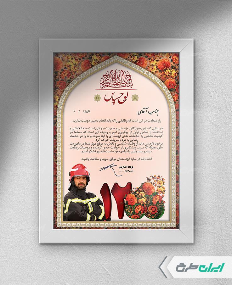 طرح لوح تقدیر آتش نشان، توسط تیم ایران طرح جهت استفاده اداره ها و سازمانها جهت تقدیر و تشکر از کارمندان طراحی و در دسترس کاربران سایت قرار گرفته است.