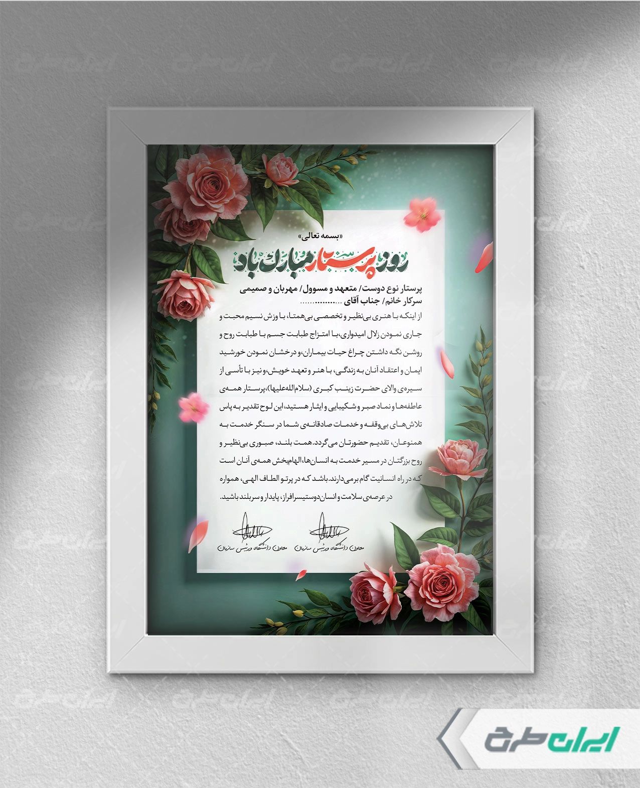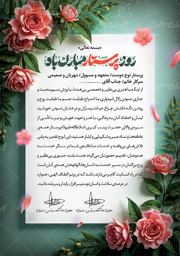 طرح لایه باز لوح تقدیر روز پرستار، یک فایل طراحیشده با فرمت قابل ویرایش (معمولاً PSD یا AI) است که به مناسبت گرامیداشت روز پرستار تهیه میشود. این طرحها معمولاً دارای المانهای بصری مرتبط با حرفه پرستاری مانند نمادهای سلامت، تصویر حضرت زینب (س) به عنوان الگوی پرستاران، یا پسزمینههایی با رنگهای آرامشبخش هستند. وجود لایههای قابل ویرایش به طراحان و مسئولان این امکان را میدهد تا متن دلخواه، نام پرستار، امضای مقام مسئول و تاریخ را به سادگی وارد و شخصیسازی کنند.