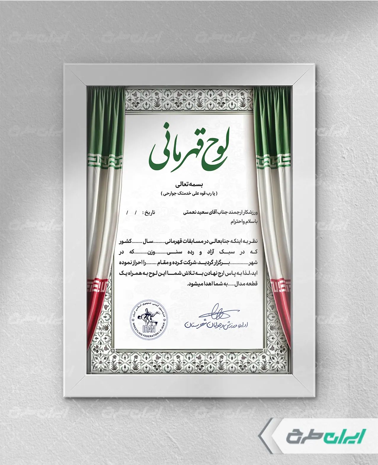 طرح لوح تقدیر قهرمانی، توسط تیم ایران طرح جهت تقدیر و تشکر از ورزشکاران طراحی و در دسترس کاربران سایت قرار گرفته است.