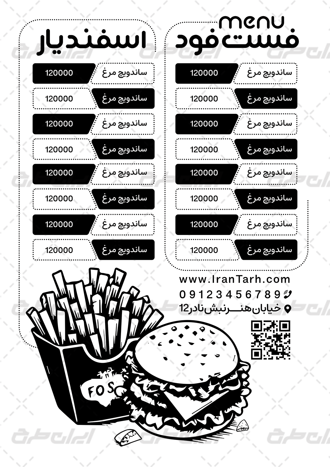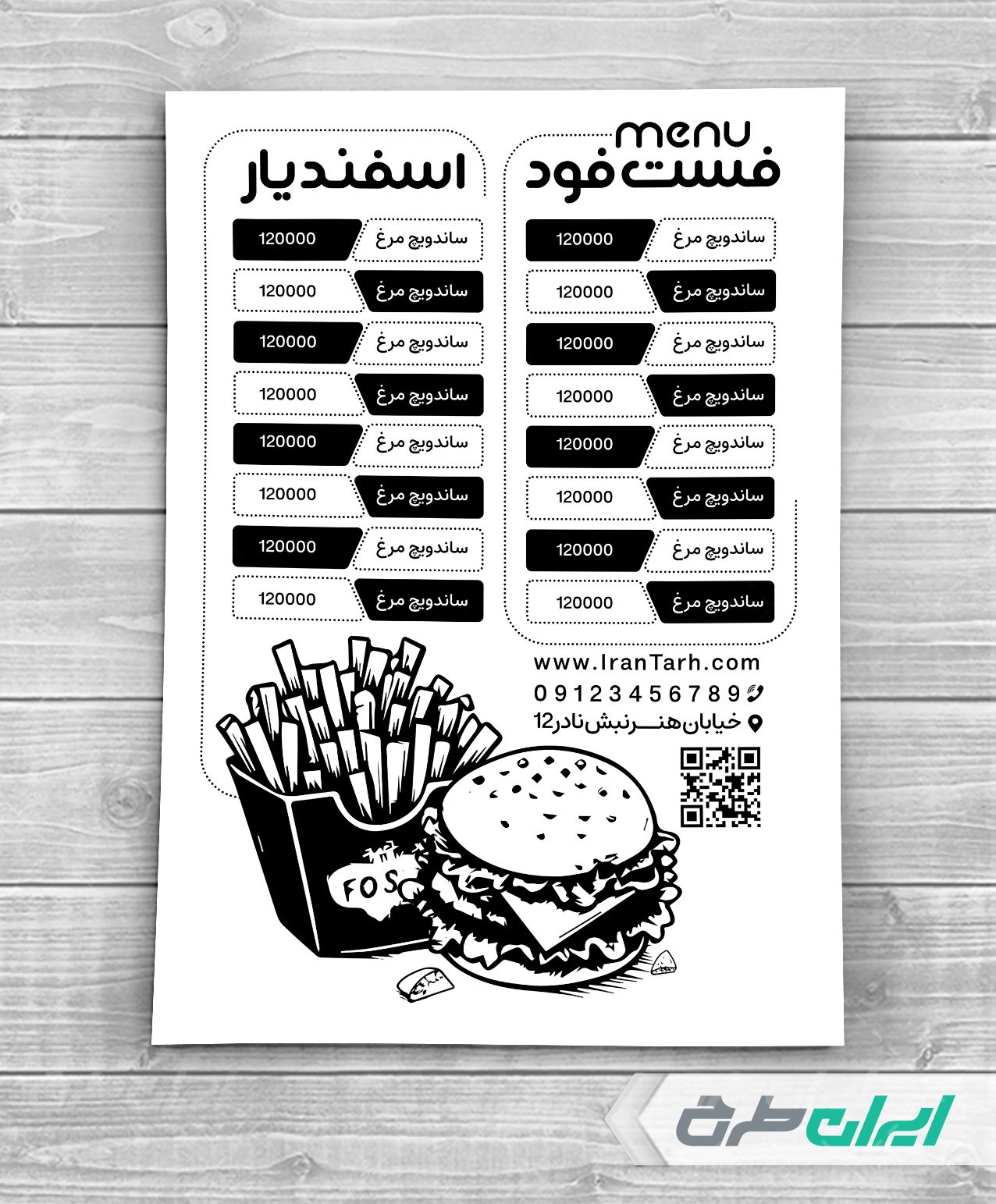 طرح تراکت سیاه و سفید اغذیه توسط تیم حرفه ای ایران طرح طراحی و در دسترس کاربران سایت قرار گرفته است.