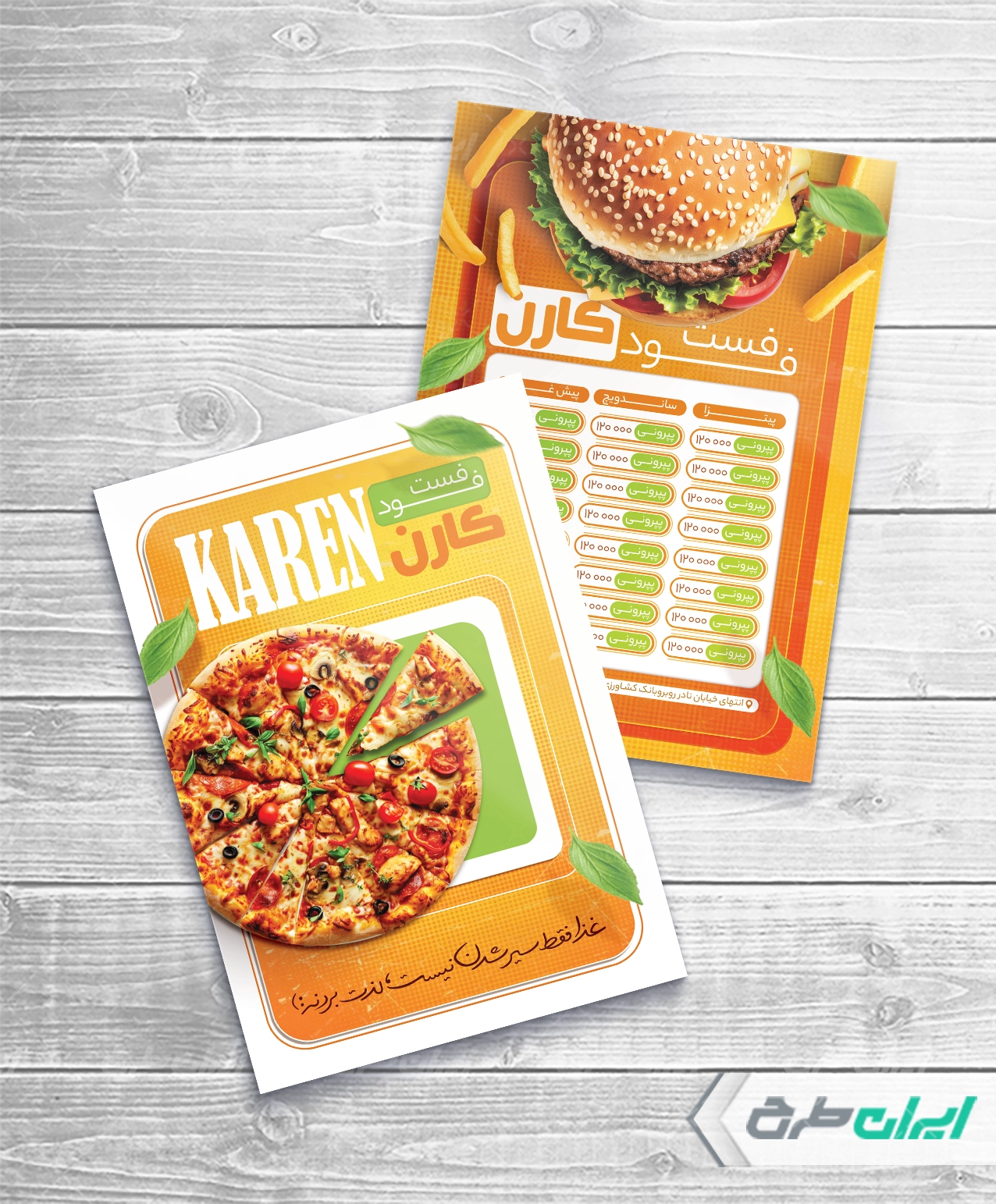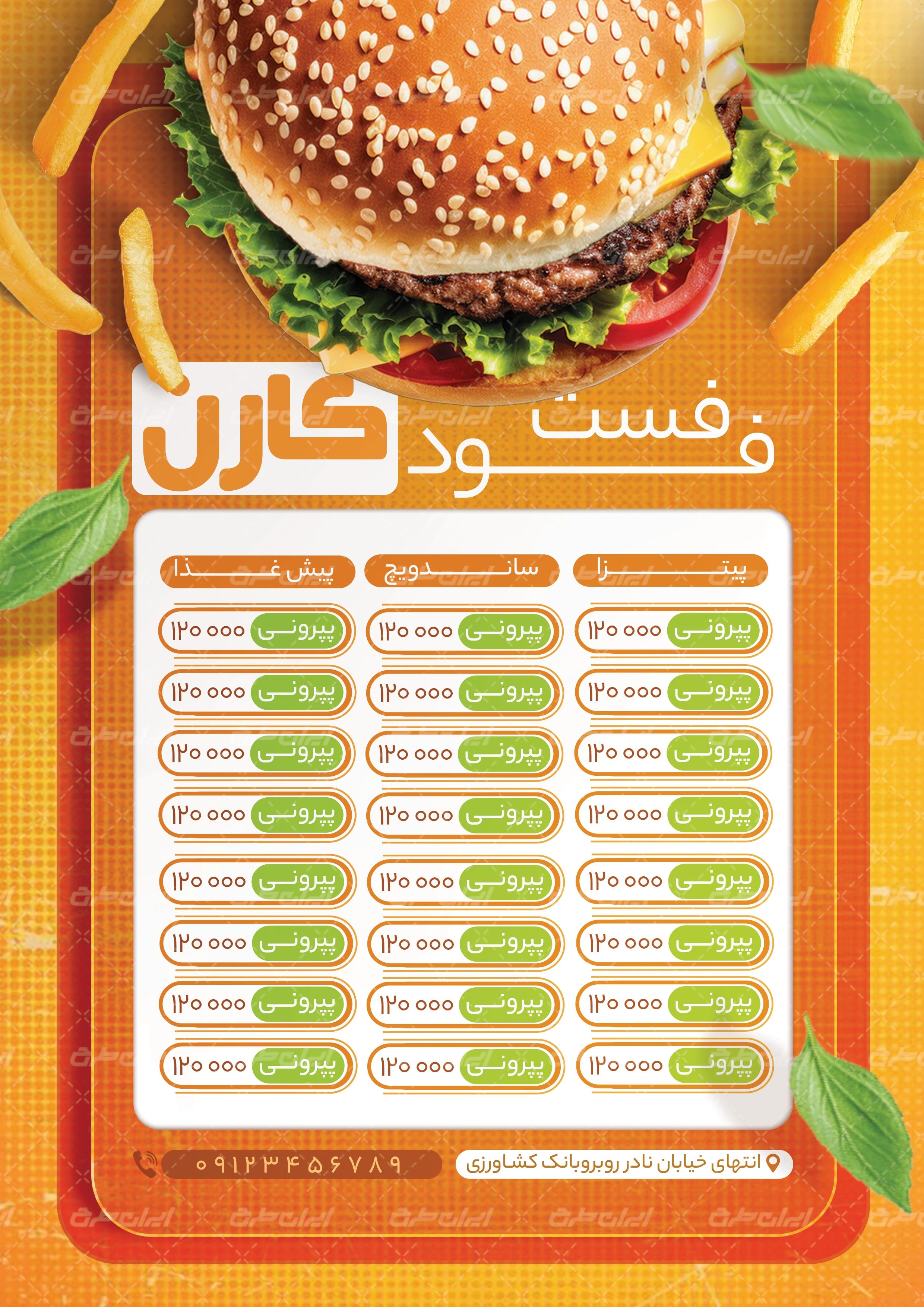 طرح منوی فست فود جهت استفاده این دسته از رستوران ها توسط طراحان ایران طرح طراحی، و در دسترس کاربران سایت قرار گرفته است.
