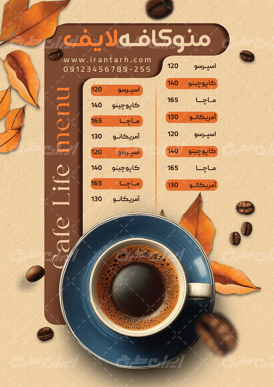 - استفاده مناسب از عکس با کیفیت دانه قهوه و فنجان که مناسب طرح منو کافه قهوه می باشد.
