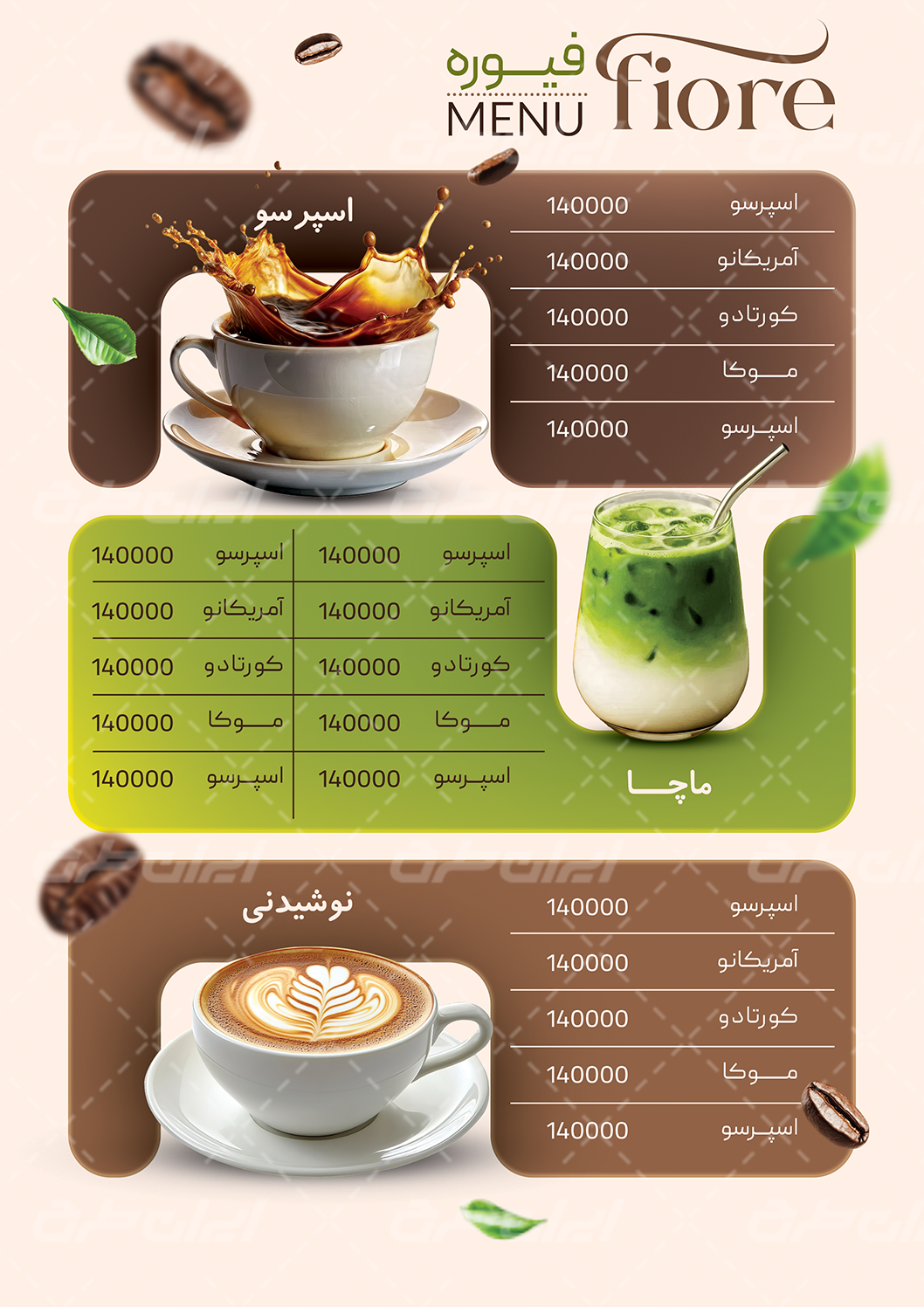 - استفاده مناسب از عکس با کیفیت دانه قهوه و فنجان که مناسب طرح منو کافه قهوه می باشد.